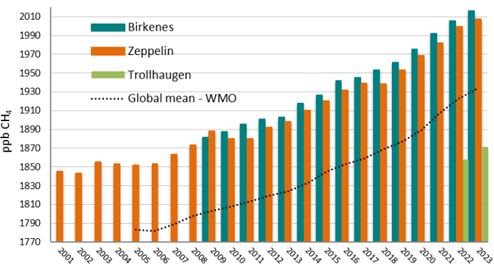 Nivåa av klimagassar i atmosfæren held fram med å stige. I 2023 vart det målt rekordhøge konsentrasjonar av klimagassar i atmosfæren over Noreg - og globalt. Spesielt raskt aukar konsentrasjonen av metan (CH4).