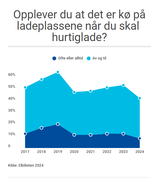 Antallet som opplevde ladekø økte fra 47 prosent i 2020 til 53 prosent i 2023, mens det i 2024 falt til 42 prosent. Tallene er hentet fra Elbilisten, Elbilforeningens årlige undersøkelse blant landets elbilister.