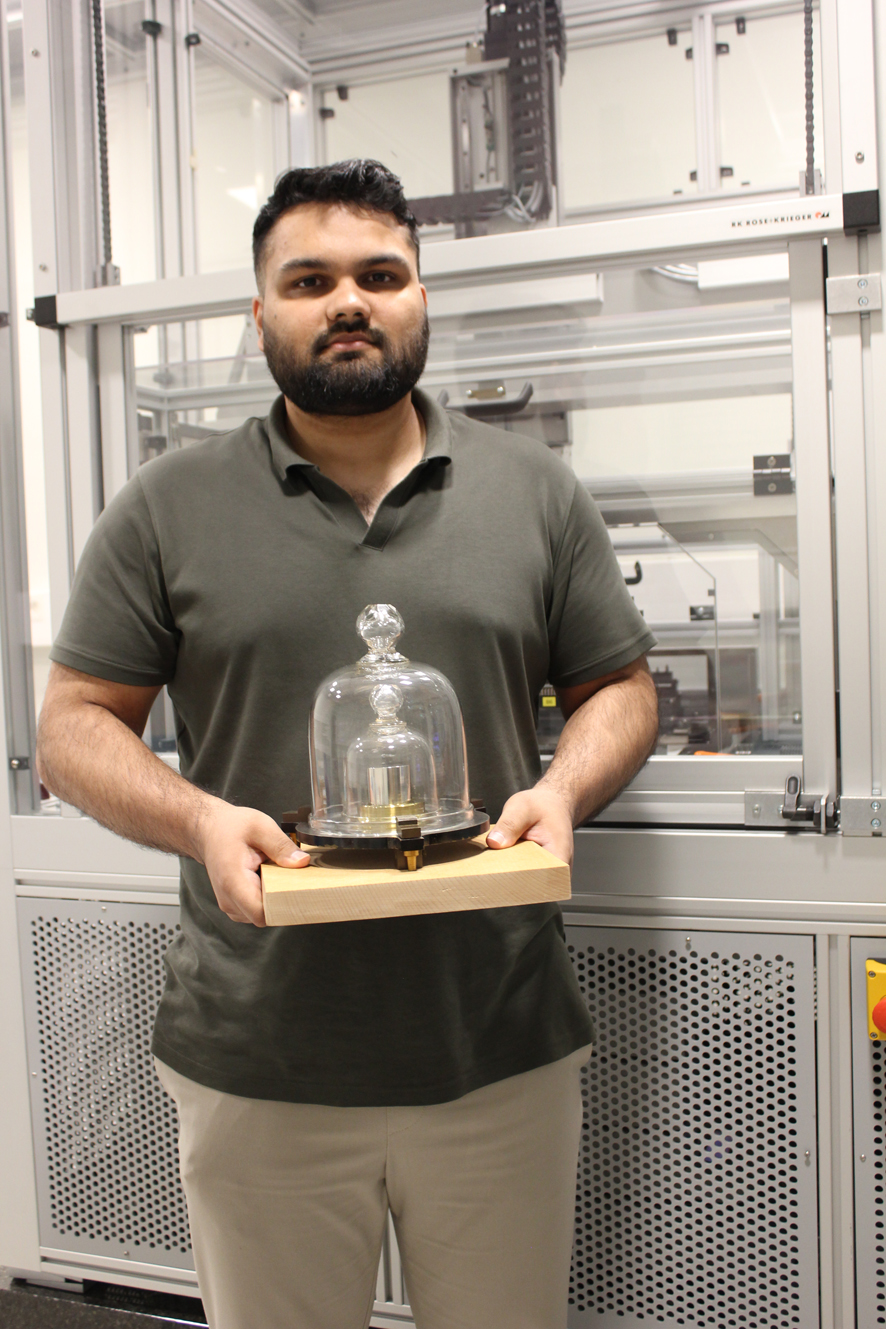 – Prototypen er laga av ei platina-iridium-legering, nærare bestemt 90 % platina og 10 % iridium. Sjølv om ho er svært motstandsdyktig mot korrosjon, kan ho danna tynne oksidlag over tid, noko som kan påverka den målte massen, seier Muhammad.