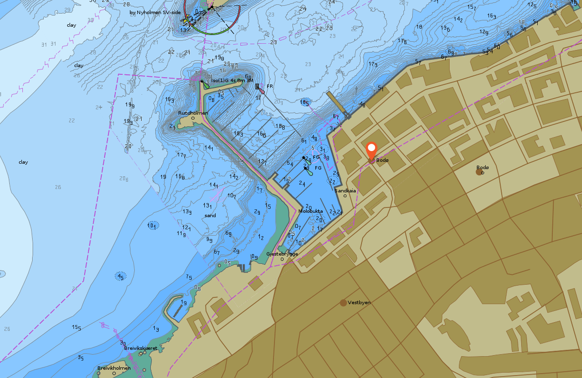 Utsnitt av digitalt sjøkart over Bodø havn viser nye tettere dybdekurver i kartet.