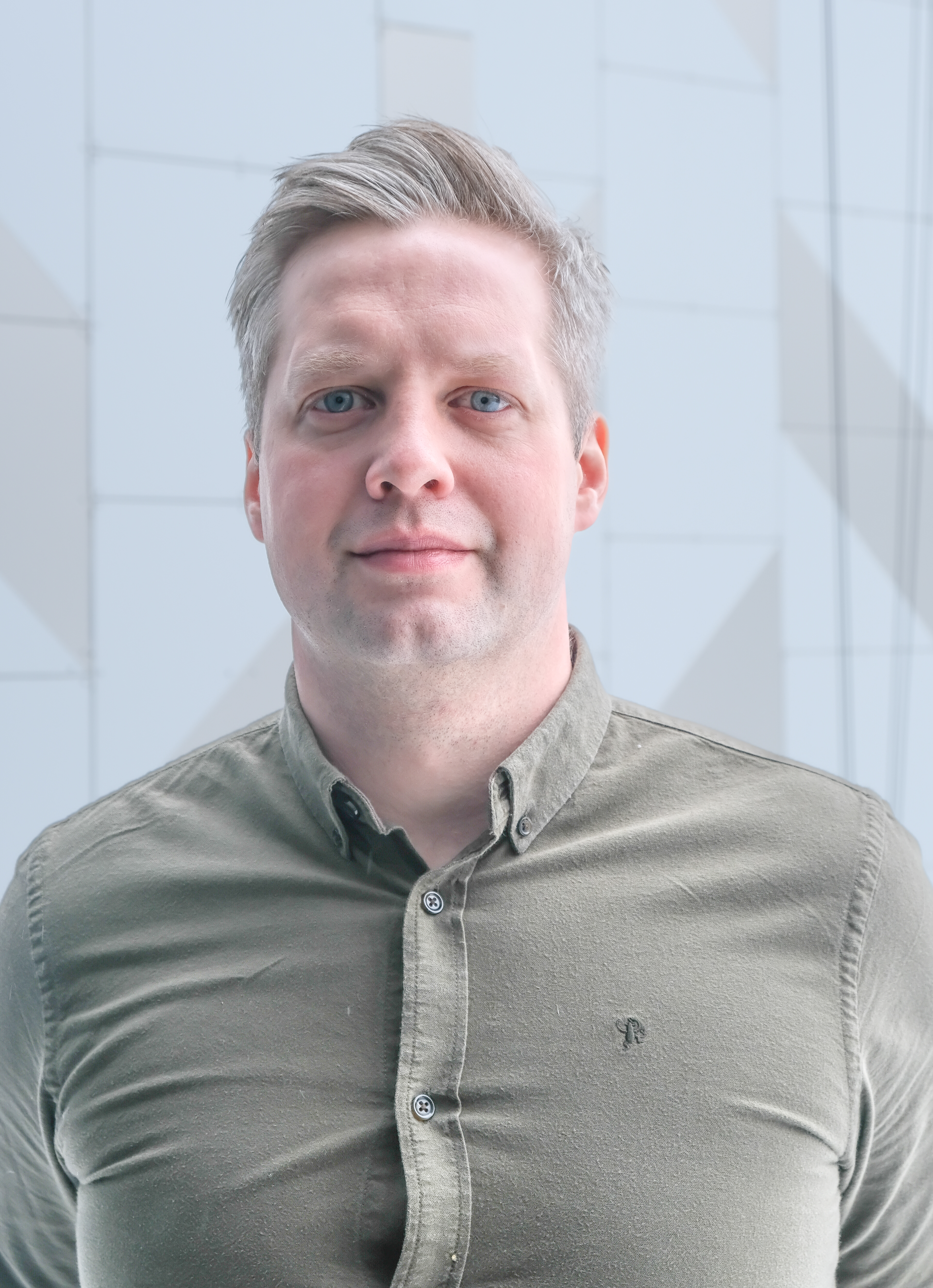 Alt tekst: En mann i grønn skjorte står foran en geometrisk bakgrunn.