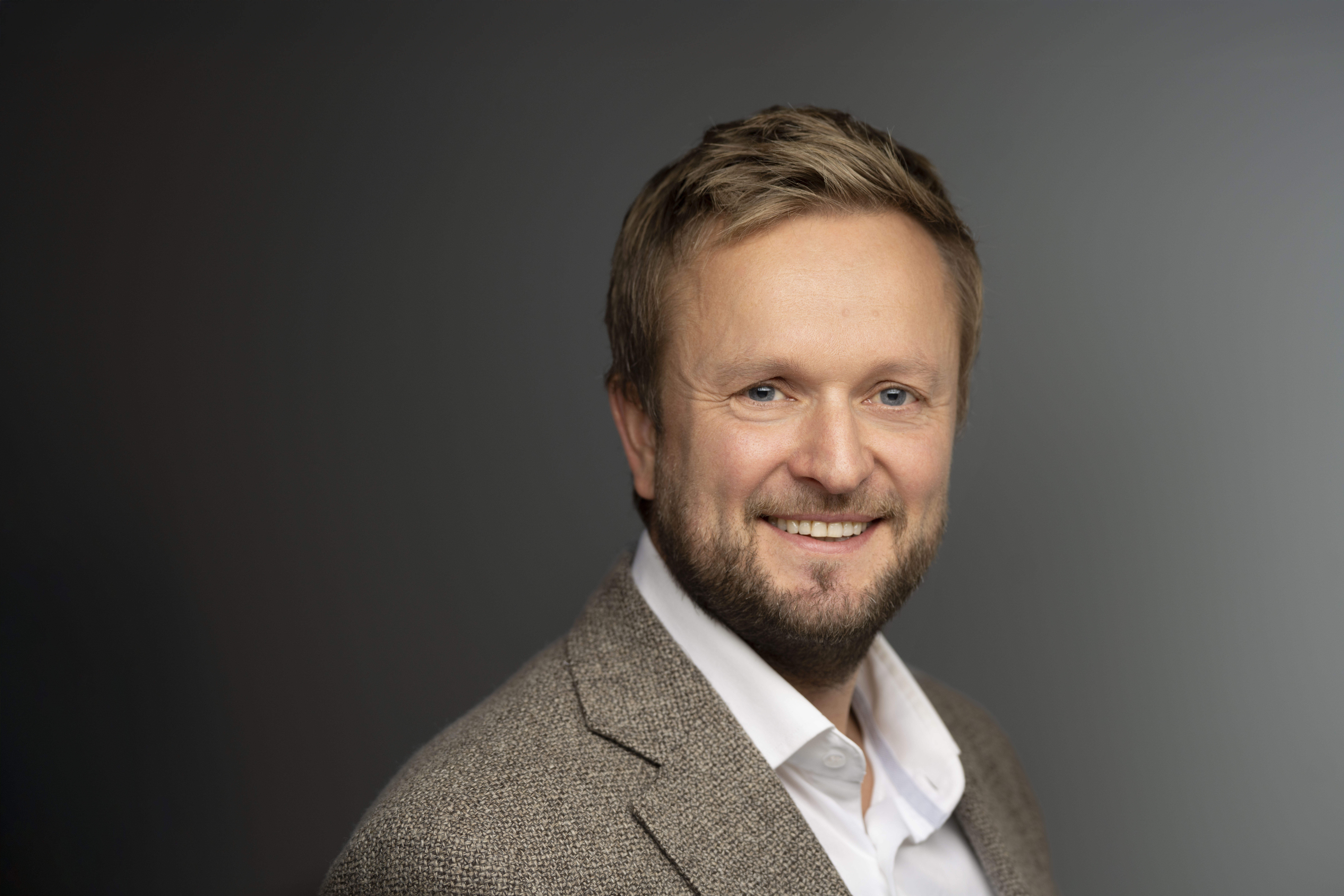 Smilende mann i dressjakke foran en nøytral bakgrunn.