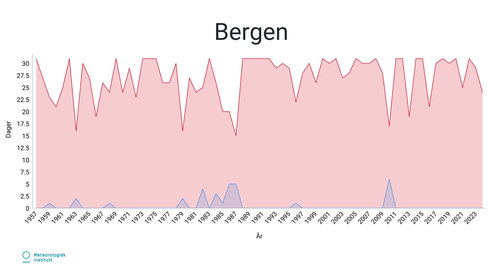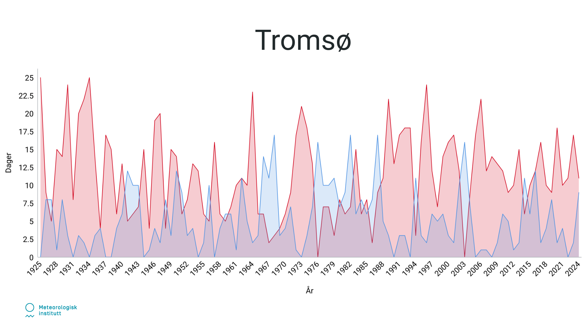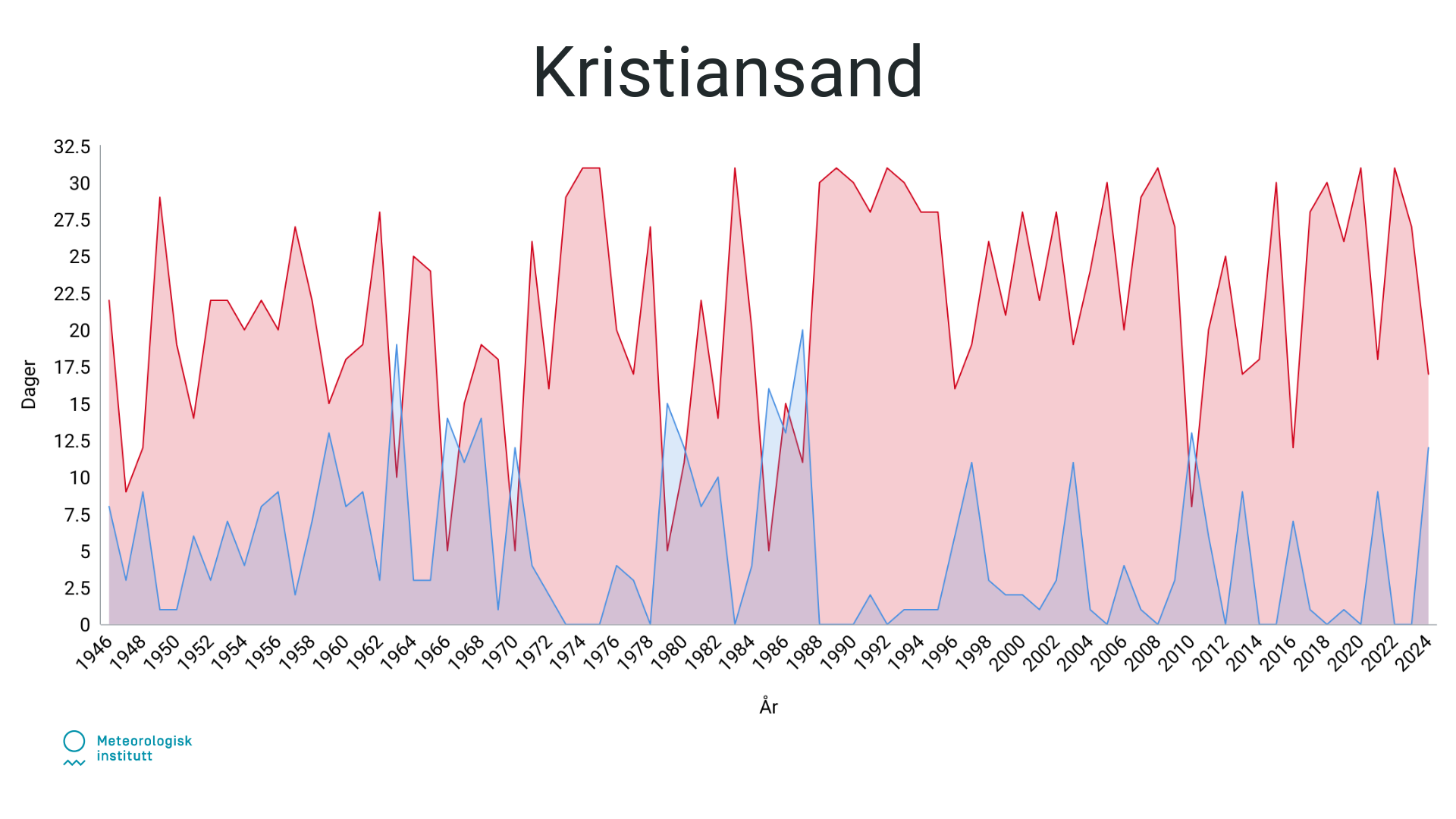Tidligere var det flere dager med lave temperaturer i januar, som vist med de høye blå toppene. Etter hvert som årene har gått, ser vi at de røde områdene og toppene har blitt mer dominerende, spesielt i de senere årene.