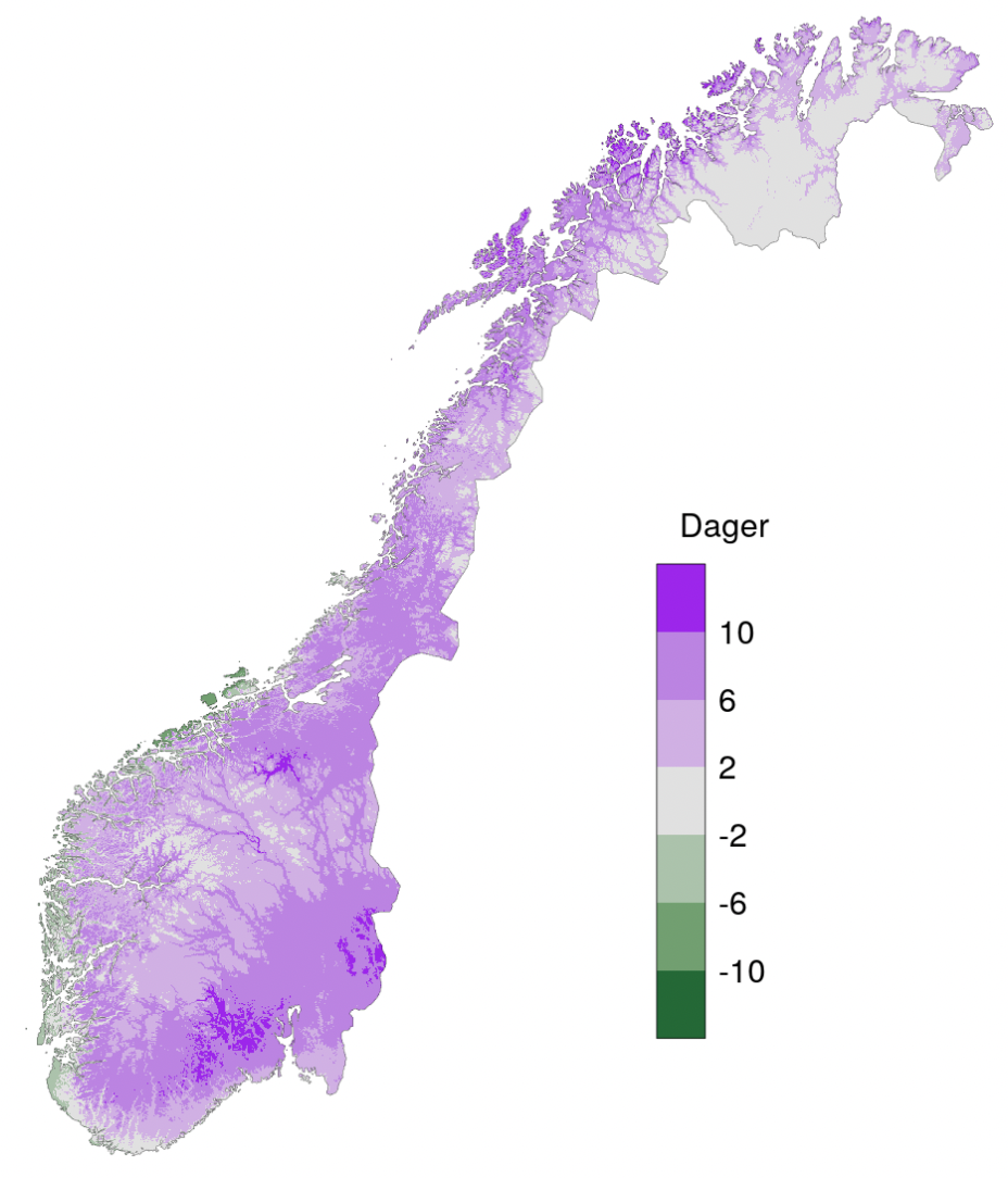 Samtidig er det slik at når vinteren blir mildere, vil denne grensen flytte seg innover i landet. Det betyr at områder som til nå har hatt en økning i antall dager med nullgradpasseringer vil få færre slike dager, fordi det rett og slett blir så mildt at temperaturen oftere vil ligge over null.