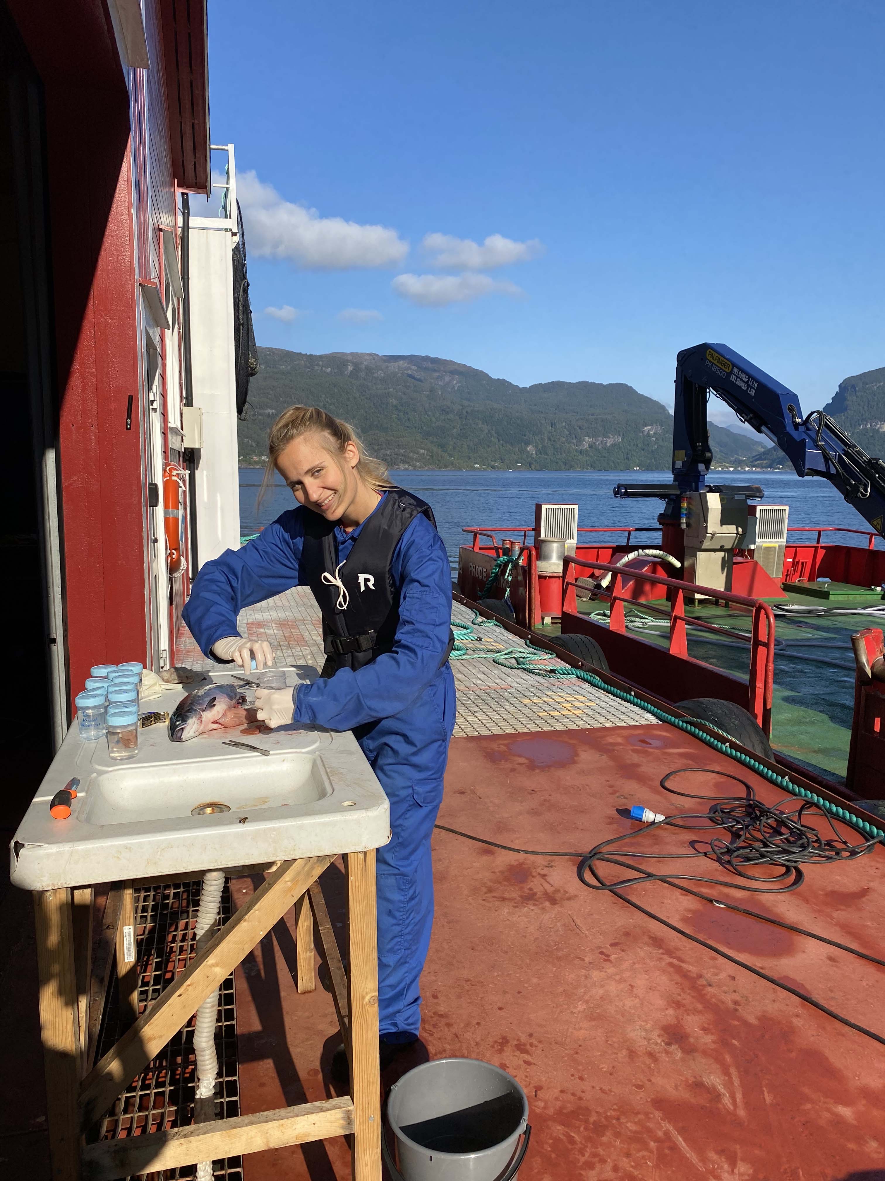 Til daglig arbeider hun for Eide Fjordbruk. Hun tar en såkalt nærings-ph.d.. Det vil si at hun er ansatt i bedriften samtidig som hun forsker ved universitetet på et tema som bedriften trenger å kunne mer om.