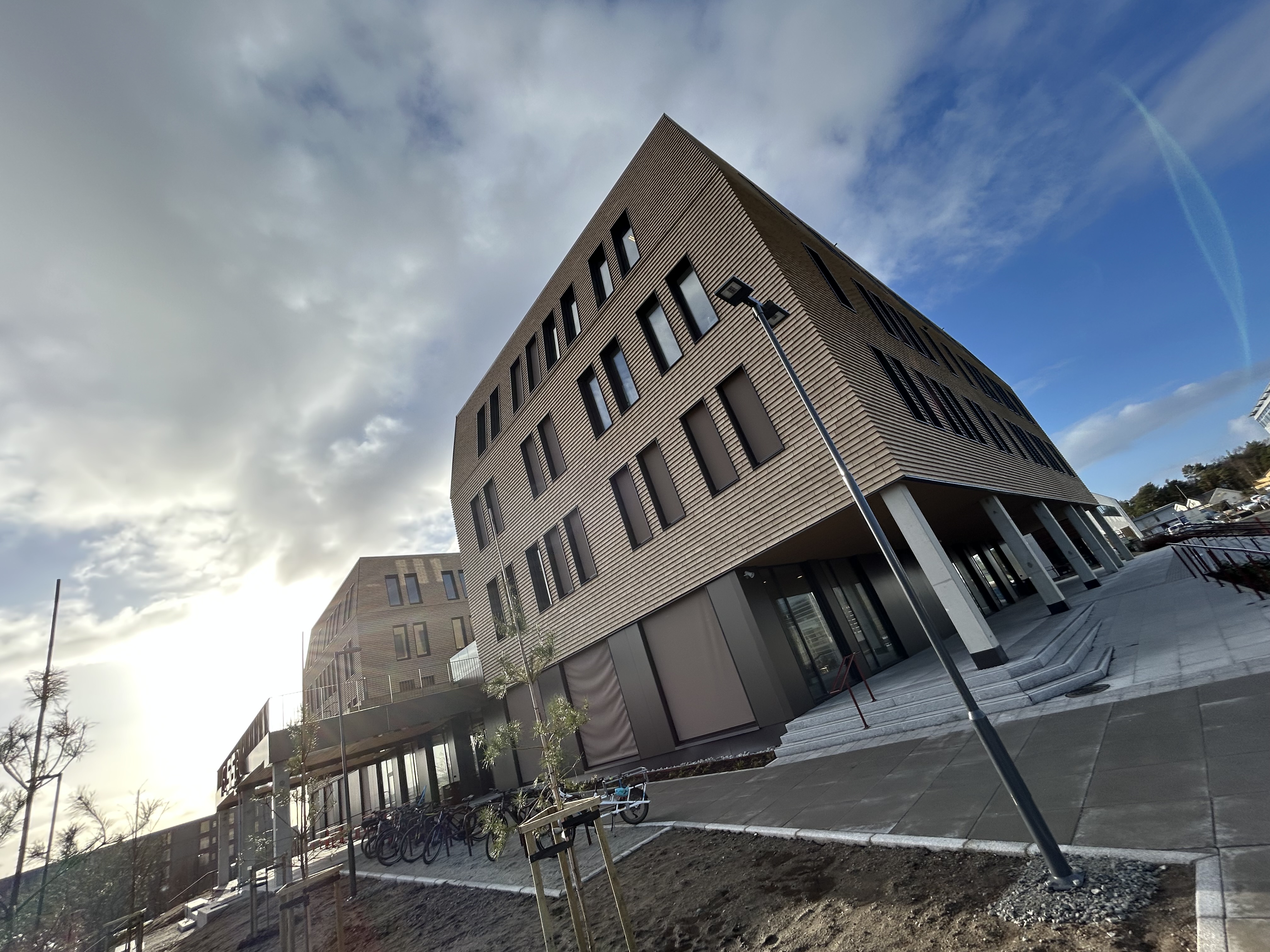 Stor bygning med sykler foran og trapp på siden