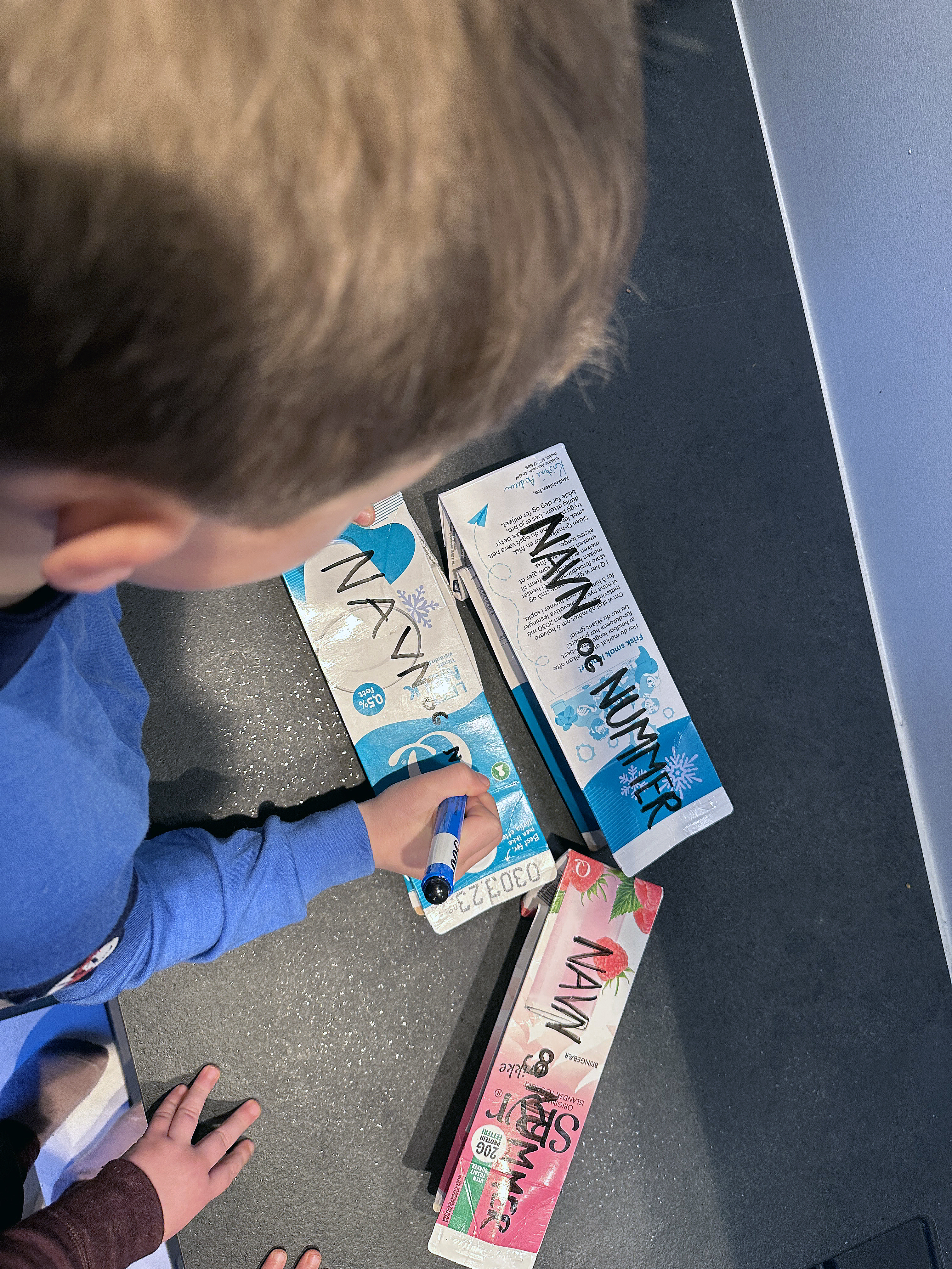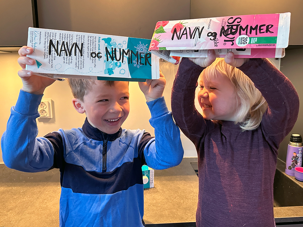 - Skyll kartongen, press den flat og skriv navn og telefonnummer på enkeltkartongen eller kubben.