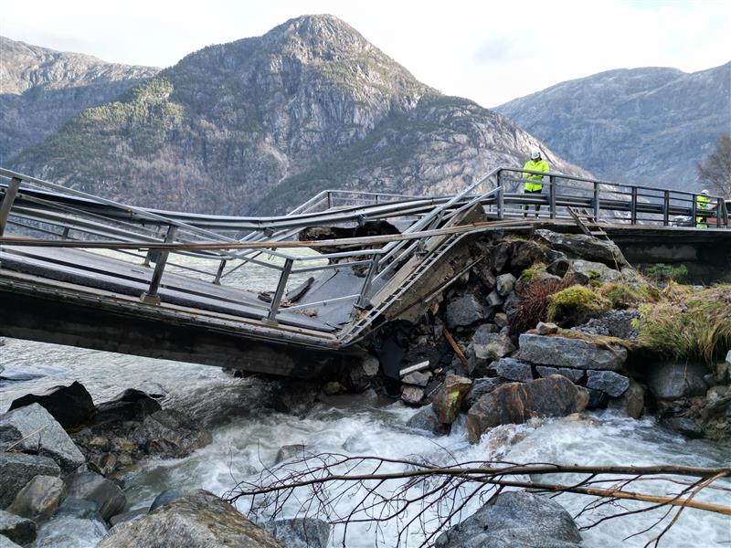 I vest er det andre utfordringar. Under ekstremvêret Jakob i november 2024 kollapsa plutseleg Edna bru i Ullensvang kommune i Vestland. Ædnafossen hadde uvanleg mykje vatn i seg, og plutseleg gav brua etter. Til saman har Jakob kosta Vestland fylkeskommune 200 millionar kroner.