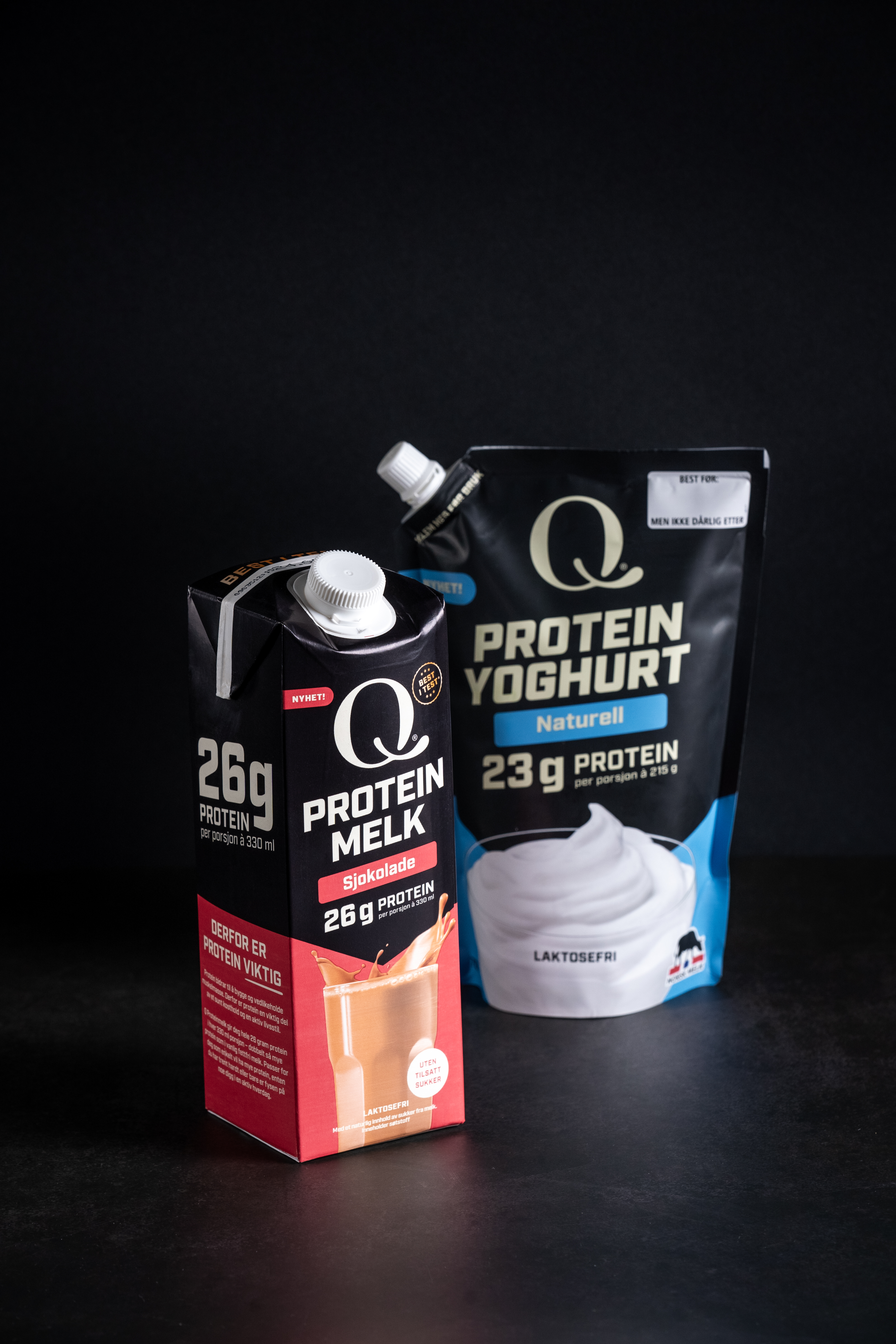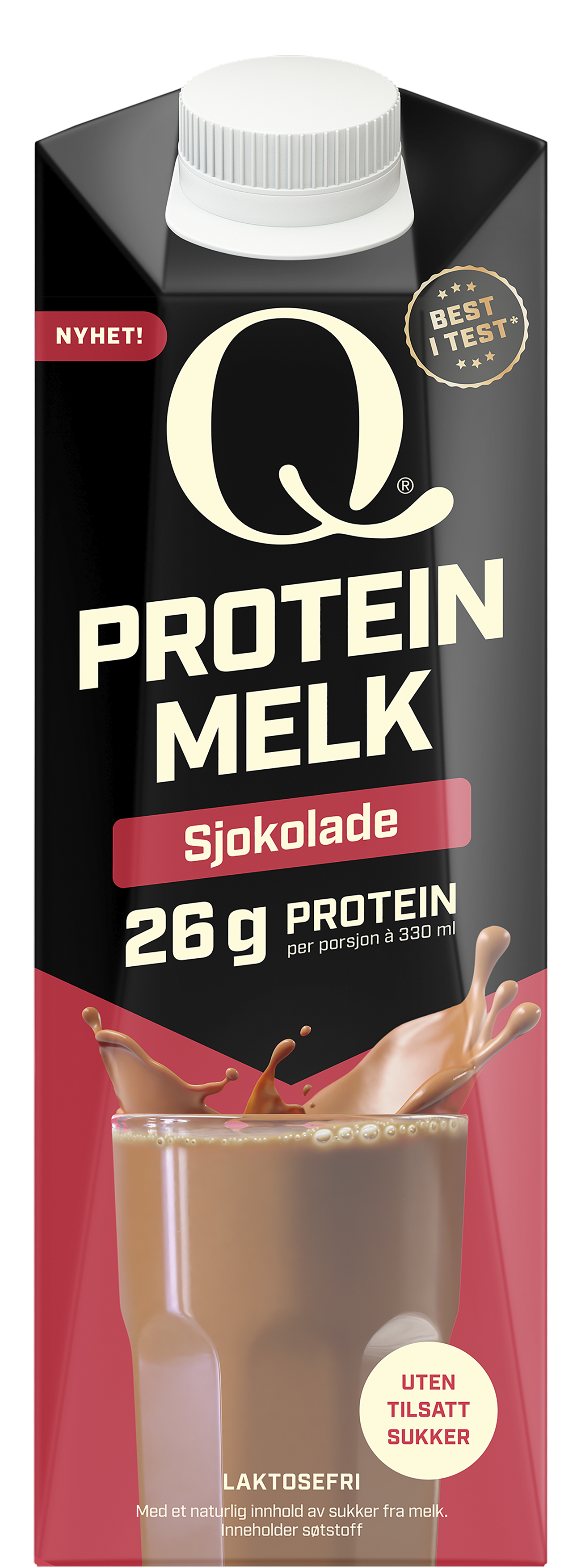 - Q Proteinmelk Sjokolade – 26 gram protein per porsjon à 330 ml, null tilsatt sukker og laktosefri. Best i test!* Smaksvinner blant proteinmelk, ifølge 208 personer (16-35 år, Faktum Markedsanalyse, august 2024).