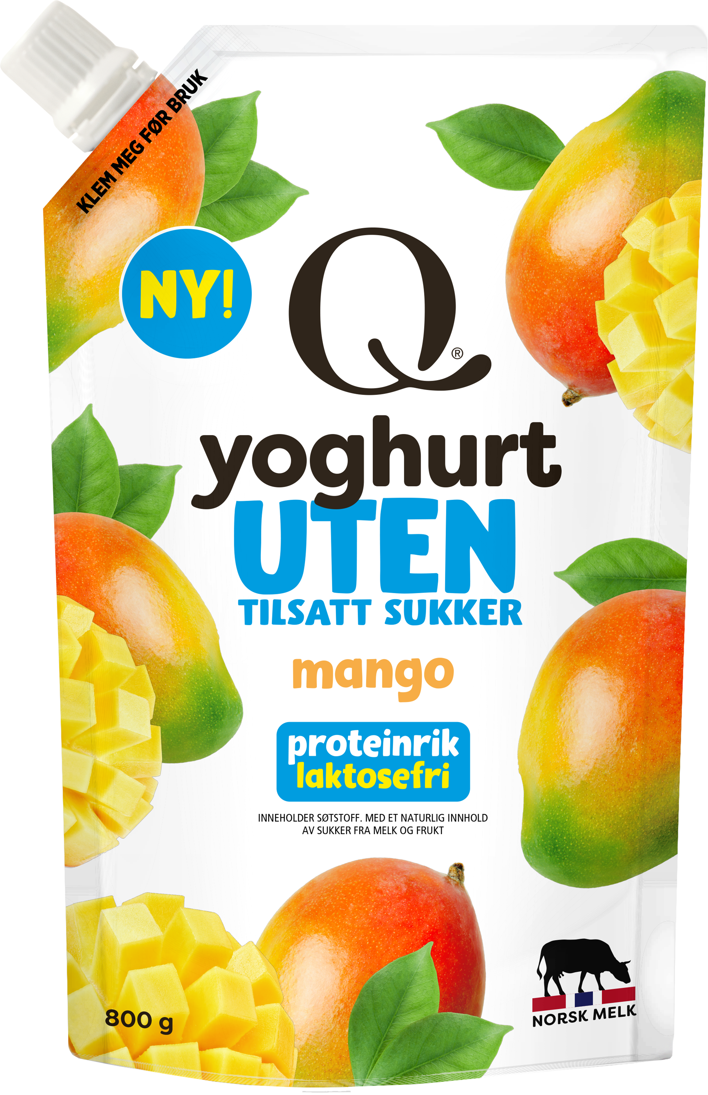 Q fortsetter å satse på smaksrik yoghurt uten tilsatt sukker, og lanserer nå Q Yoghurt Mango Uten tilsatt sukker – en frisk og fruktig yoghurt. Den kommer i 800 grams pose som gir enkel porsjonering til frokost, mellommåltid og smoothies.