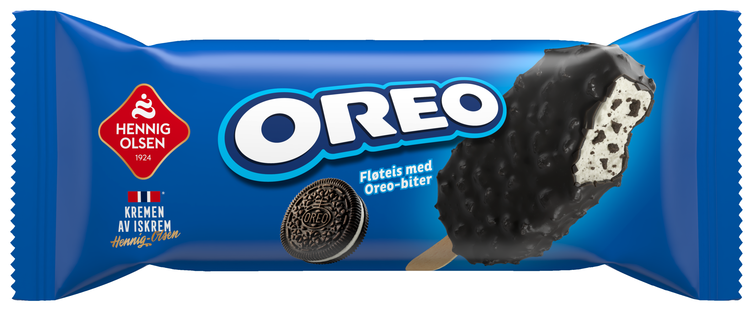 Oreo-fans, gled dere! Oreo ispinne er en fløyelsmyk fløteis med vaniljesmak, tilsatt biter av den ikoniske Oreo-kjeksen og dekket med sort sjokoladeovertrekk fylt med enda flere Oreo-biter. Verdens mest solgte kjeks kommer nå i form av en uimotståelig iskrem på pinne.