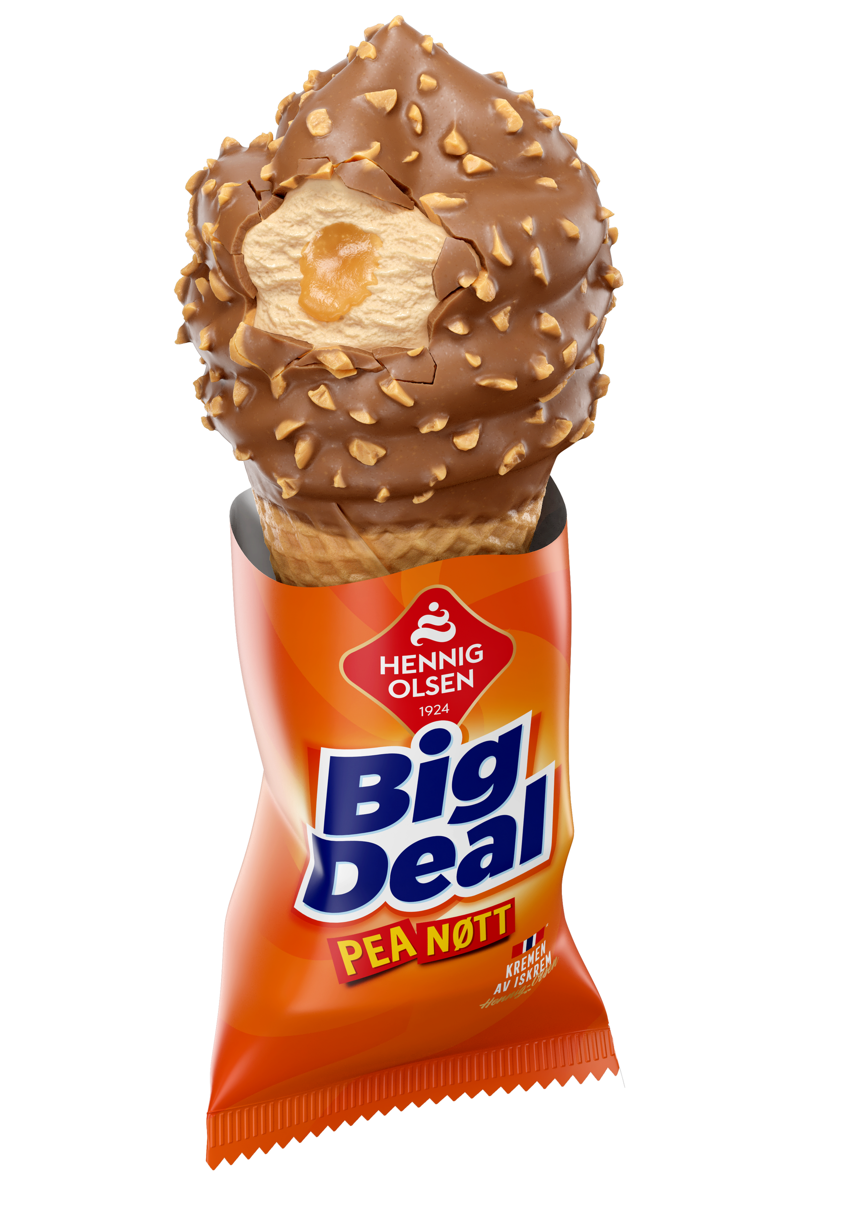 Mer is, mer smak! Big Deal Peanøtt er en stor fløteis med fyldig peanøttsmak, fylt med deilig peanøttsaus og overtrukket med melkesjokolade og hakkede peanøtter. En smakfull favoritt for deg som elsker mye iskrem på en gang!
