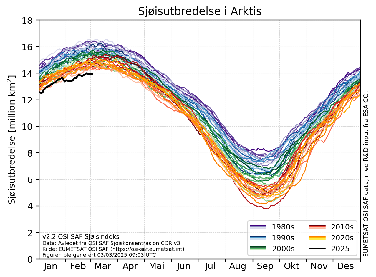 Grafen viser sjøisutbredelsen i Arktis år for år. Sort linje er 2025 (se vedlegg).