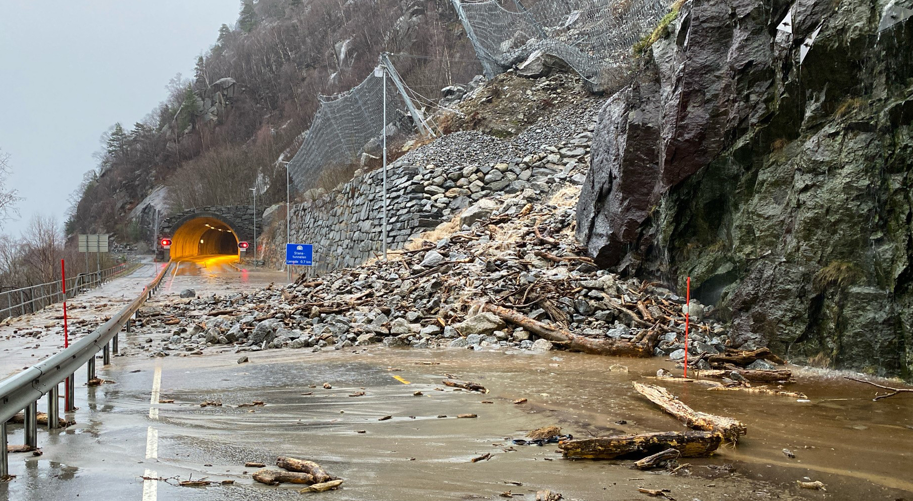 Situasjonen er uoversiktleg og utviklar seg svært raskt. Vi forventar at fleire vegar kan bli stengt av skred eller flaum på kort varsel.