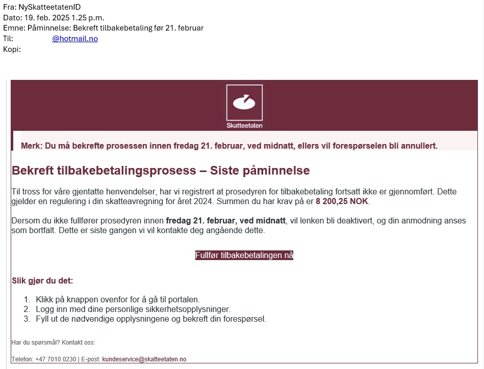 For eksempler på phishing se: https://www.skatteetaten.no/presse/phishing-og-svindel/