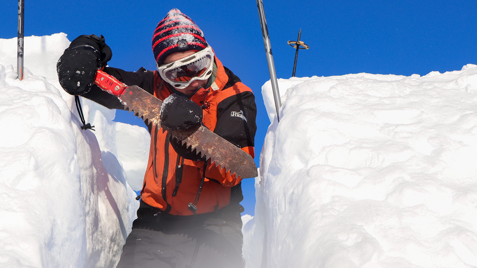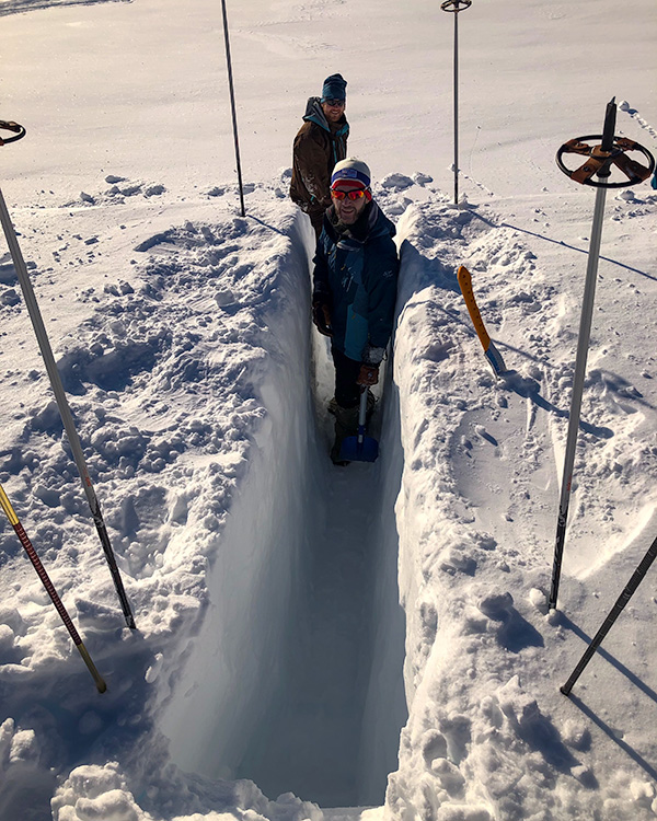 Bruk en søkestang for å sjekke at det er nok snø. Vi foretrekker å ha 2 meter dybde og 3 meter inn fra fronten av kanten. Det er mest effektivt å være to personer per kantgrop, da kan alle være aktive gjennom hele byggeprosessen. Hvis flere skal bo ved siden av hverandre, måler du opp 2 meters avstand mellom hver startgrøft. Se bilde i toppen av saken.