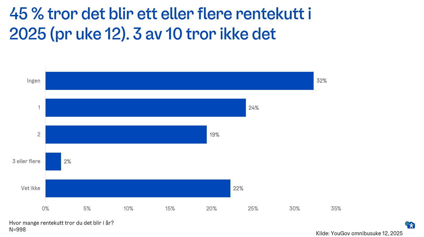 Én av tre nordmenn – 32 prosent av de spurte – tror ikke på rentekutt i 2025. 24 prosent tror på ett rentekutt, mens kun 21 prosent tror på to eller flere kutt fra sentralbanksjef Ida Wolden Bache.