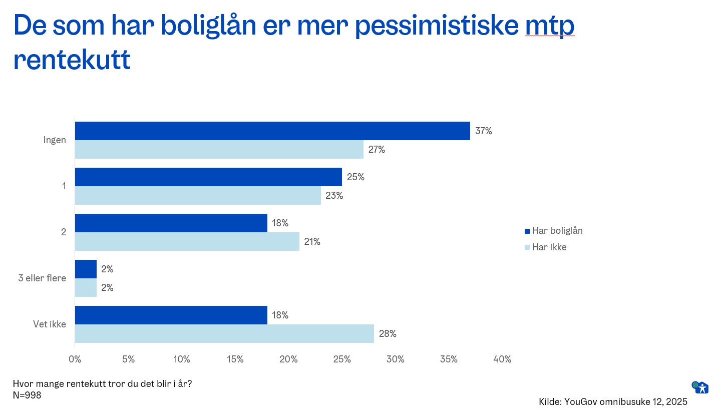 Blant de som har boliglån er pessimismen til et mulig rentekutt større. 37 prosent tror på null rentekutt, mens 25 prosent av de med boliglån tror på ett rentekutt.