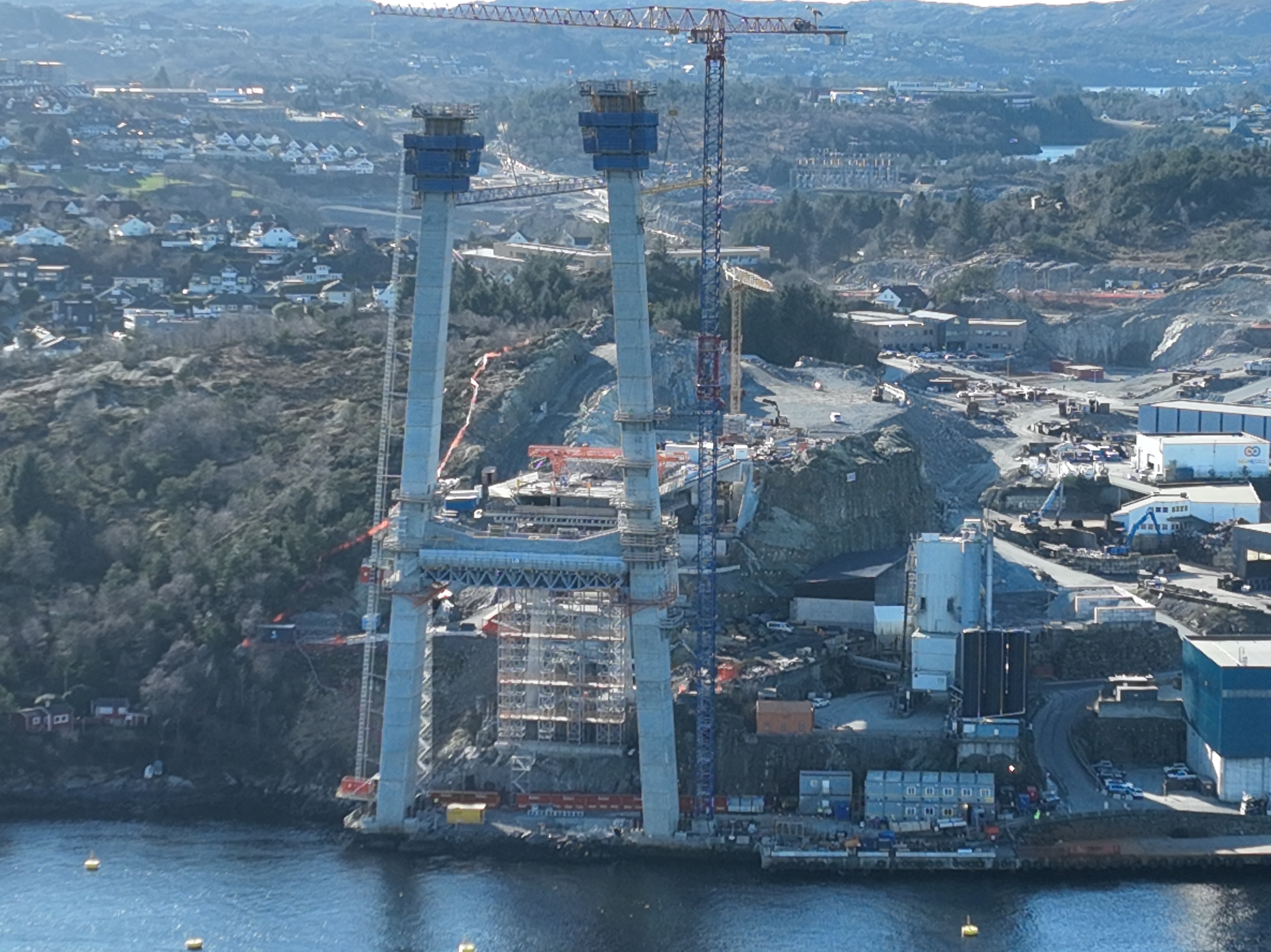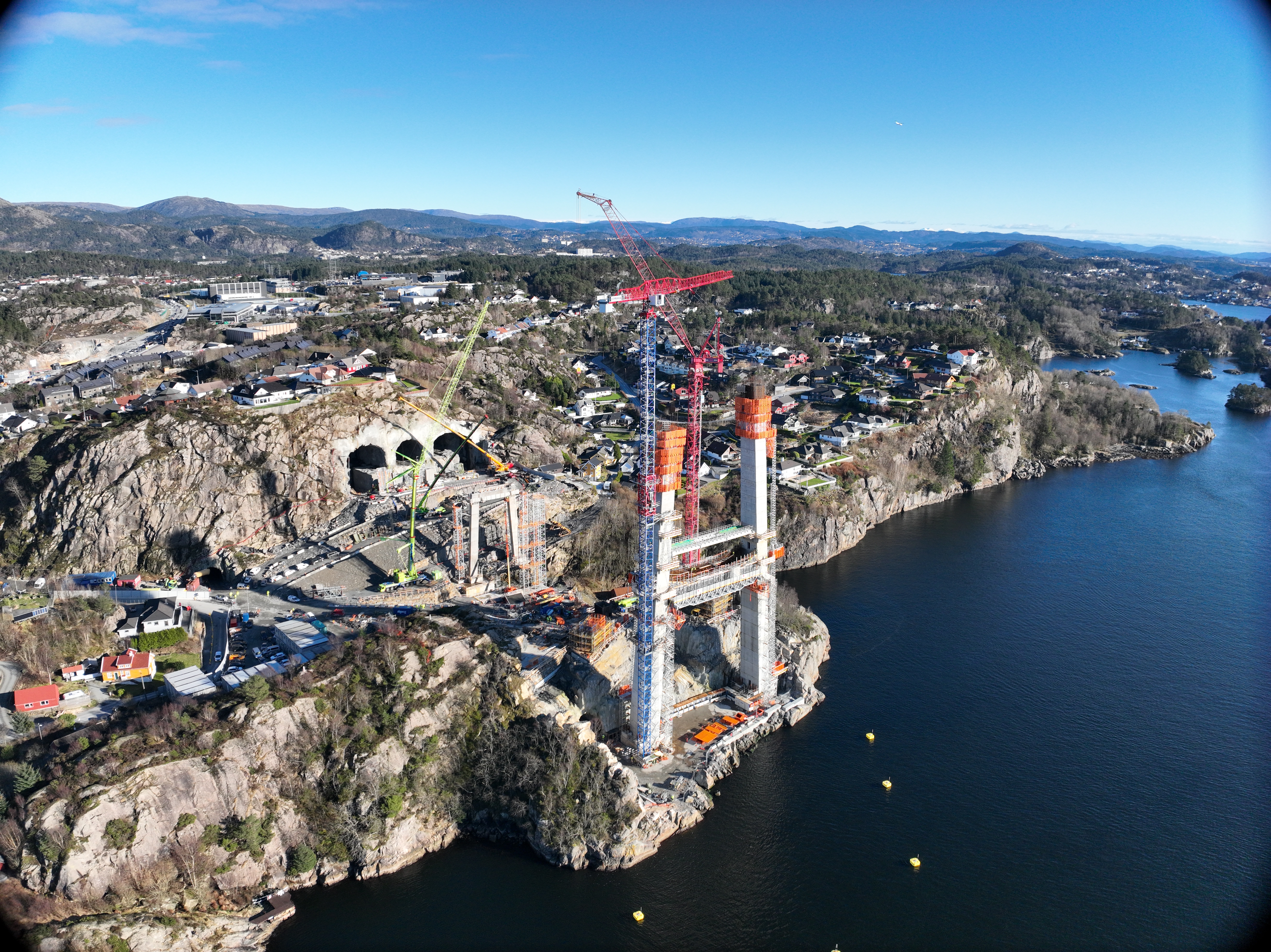 Brutårna på Nye Sotrabru har nådd 100 meter på begge sider av Vatlestraumen. Tårna vil stå ferdige i sommar, og arbeidet med å trekke kablane mellom dei to tårna startar i haust.