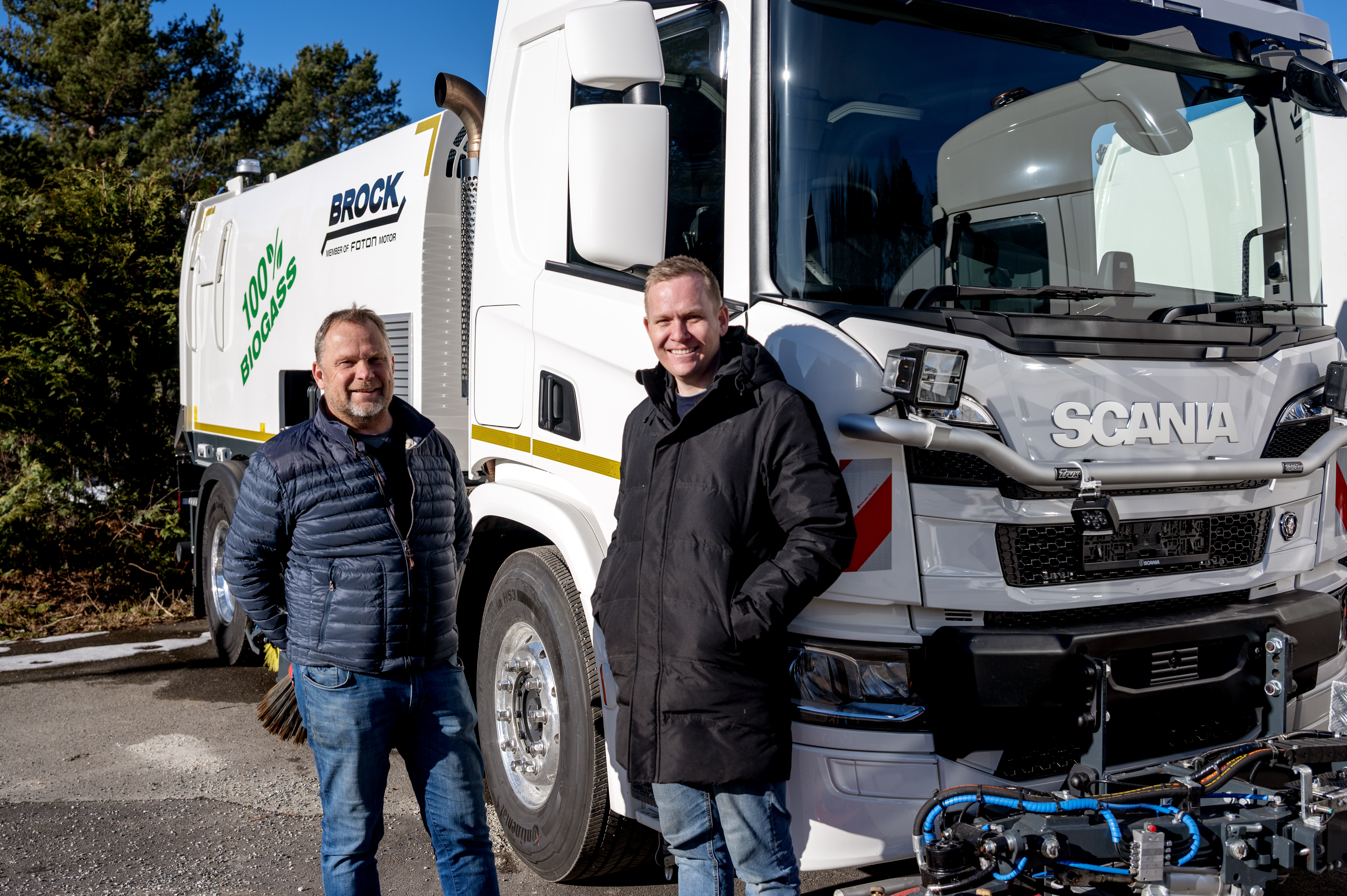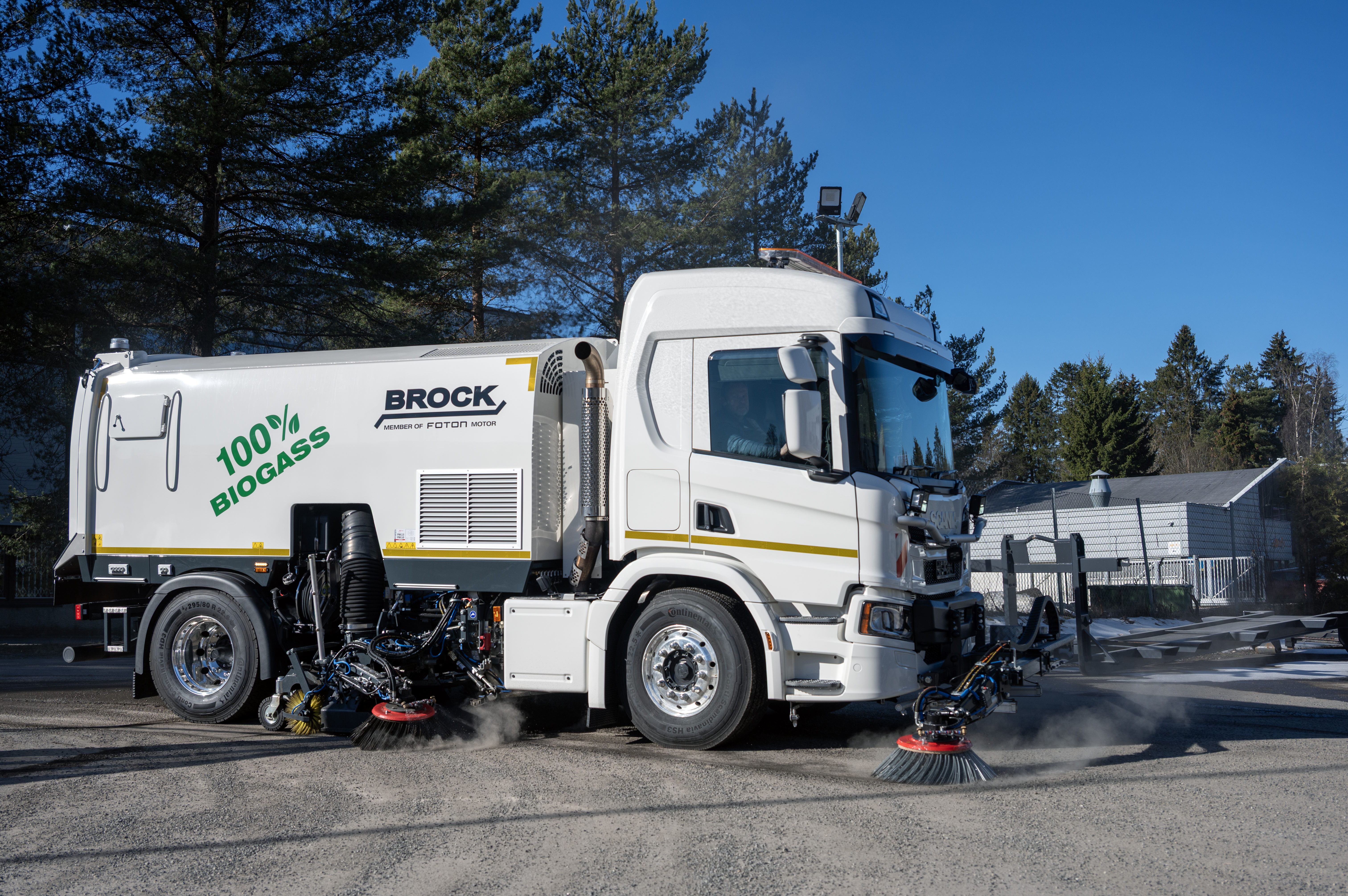 Den nye feiebilen er bygget på et Scania P340 4x2-chassis med påbygg fra Brock. Bilen har en 9-liters gassmotor som går på klimavennlig biogass som drivstoff.
