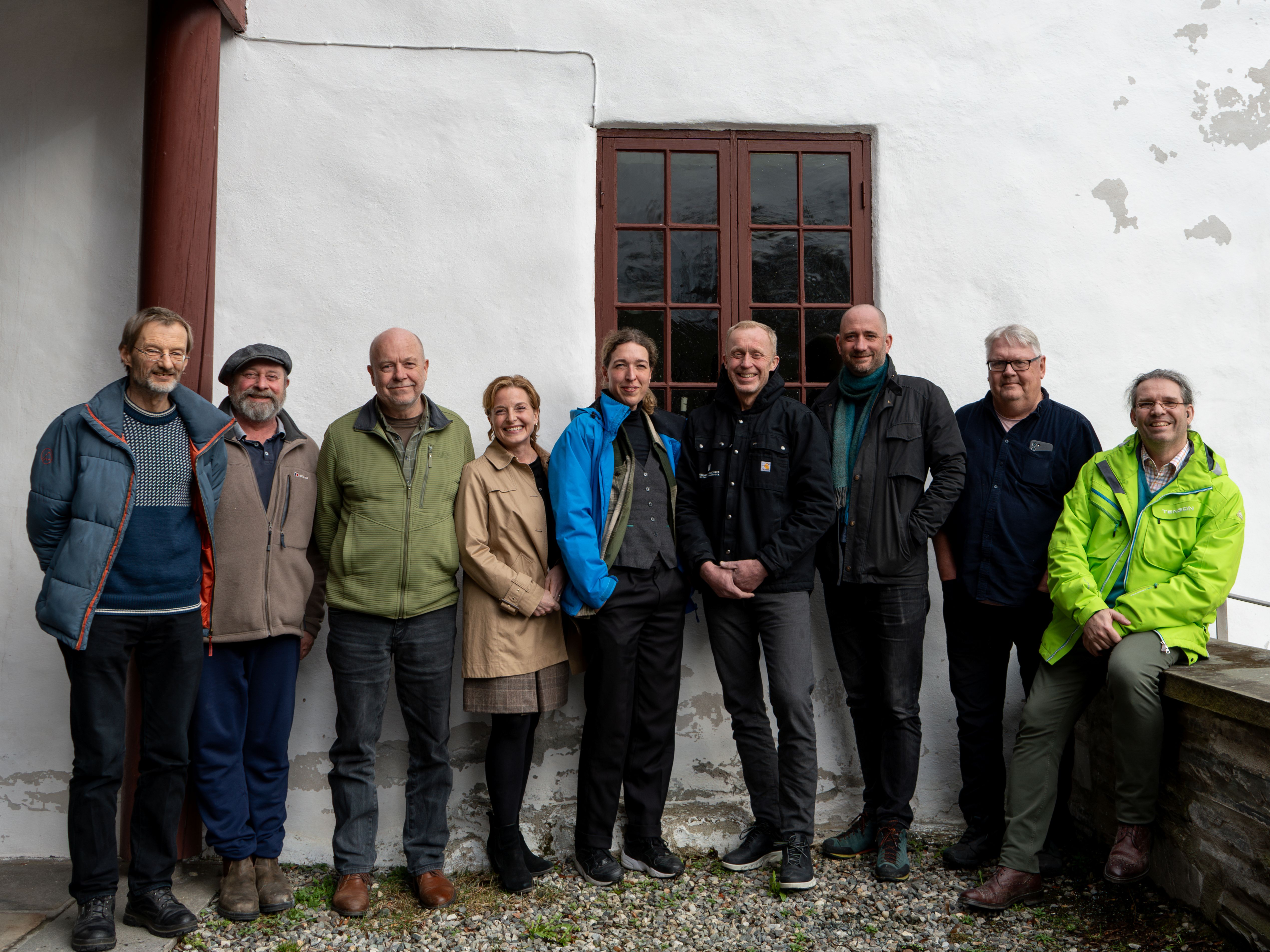 Åtte menn og en kvinne står foran en hvitkalket murvegg.