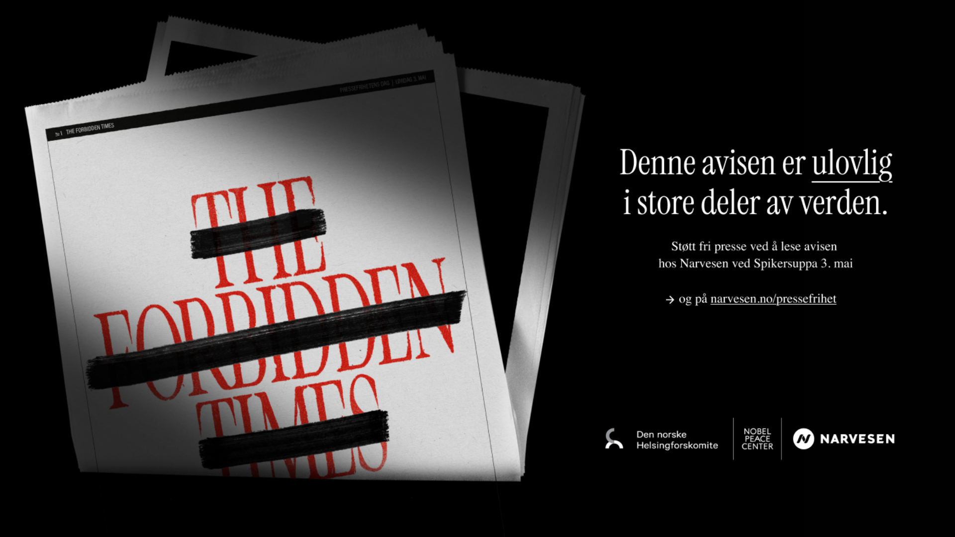 I samarbeid med Nobels Fredssenter og Helsingforskomiteen, gir Narvesen ut en «ulovlig» avis på FNs internasjonale dag for pressefrihet lørdag 3. mai. Avisen «The Forbidden Times» er en eksklusiv utgivelse bestående av artikler som er forbudt å publisere i sine opprinnelsesland.