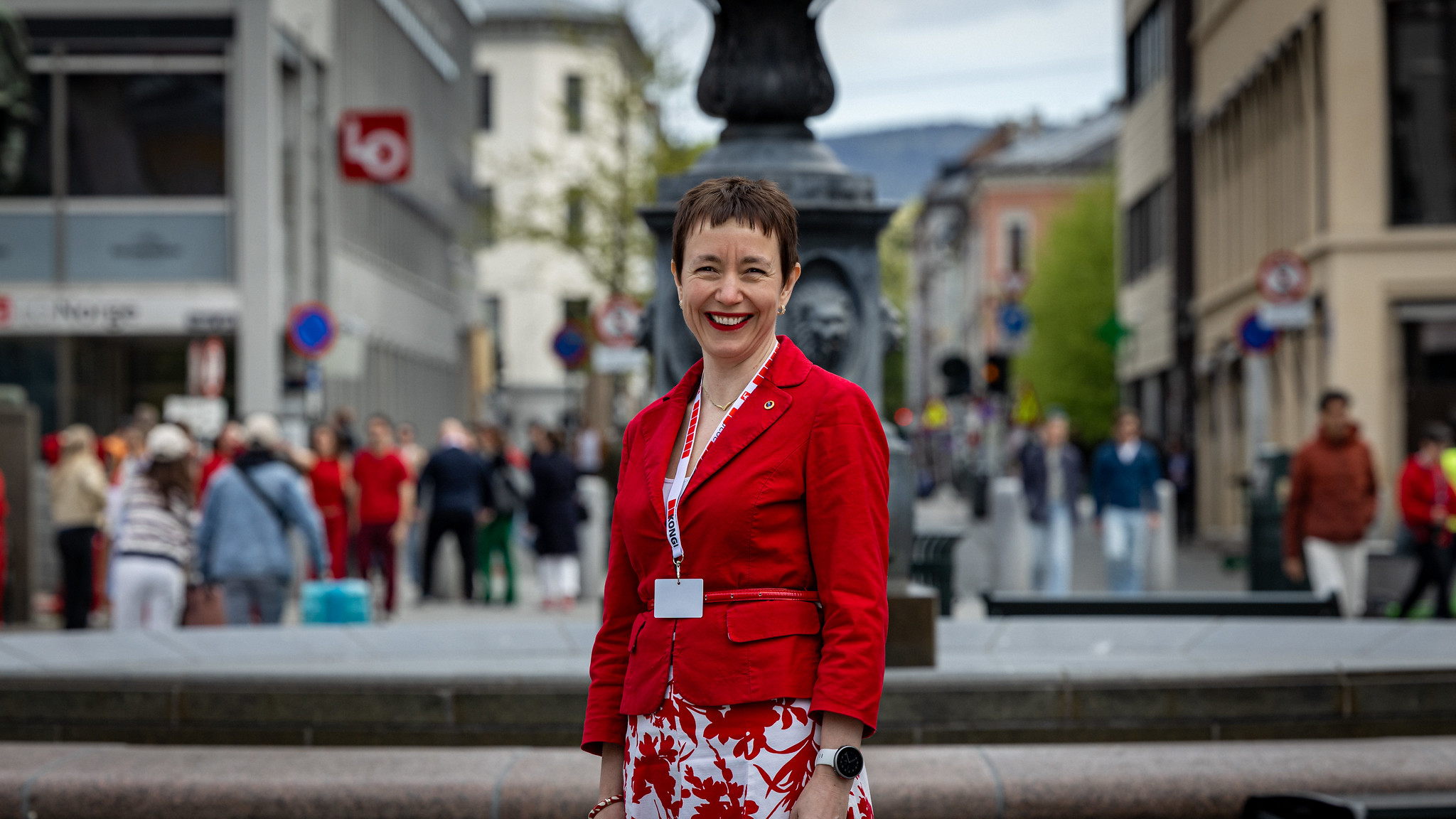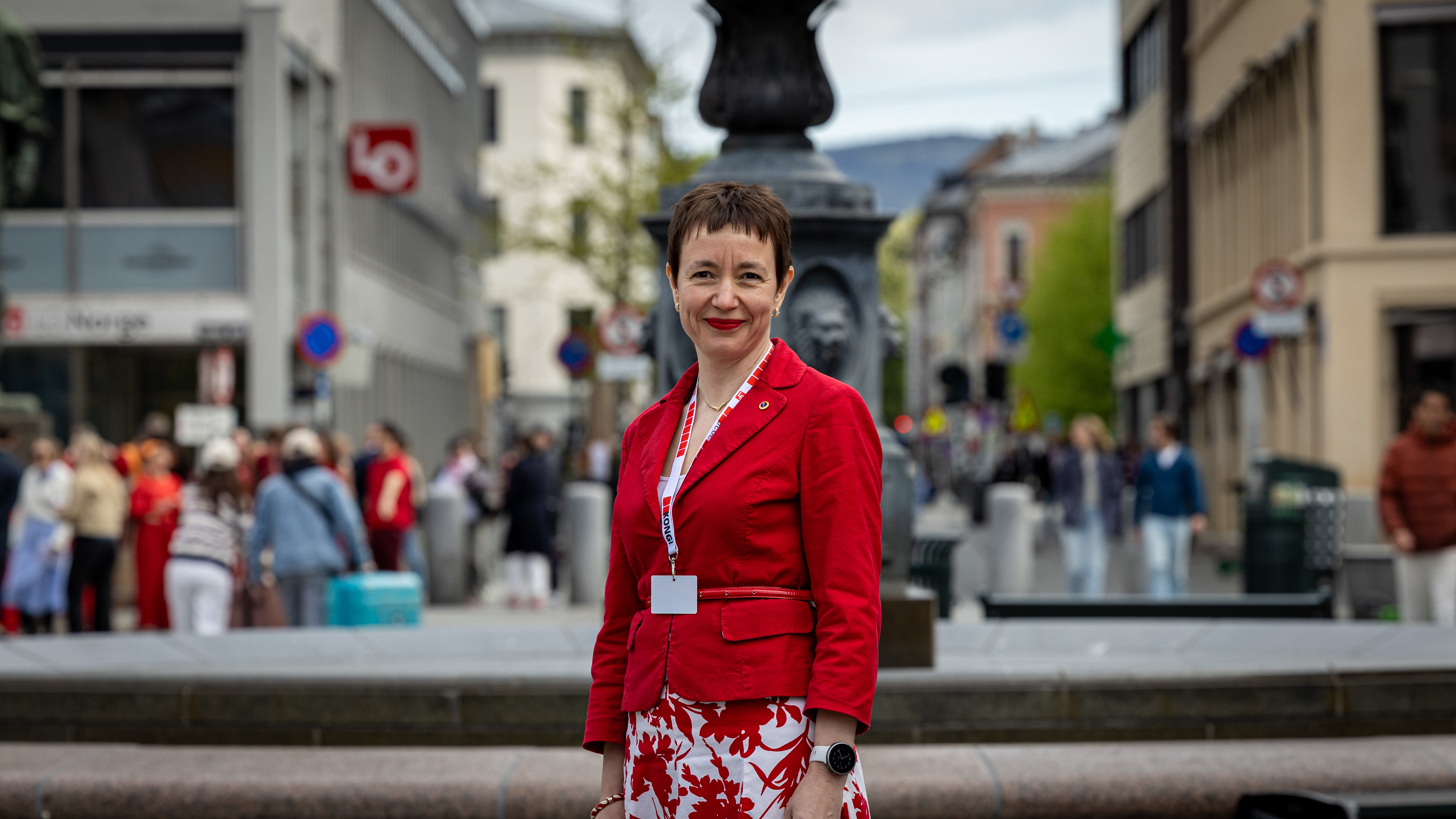 Ingerid Marie Utvik i rød dressjakke foran fontenen på Youngstorget, LO-bygget såvidt synlig i bakgrunnen.