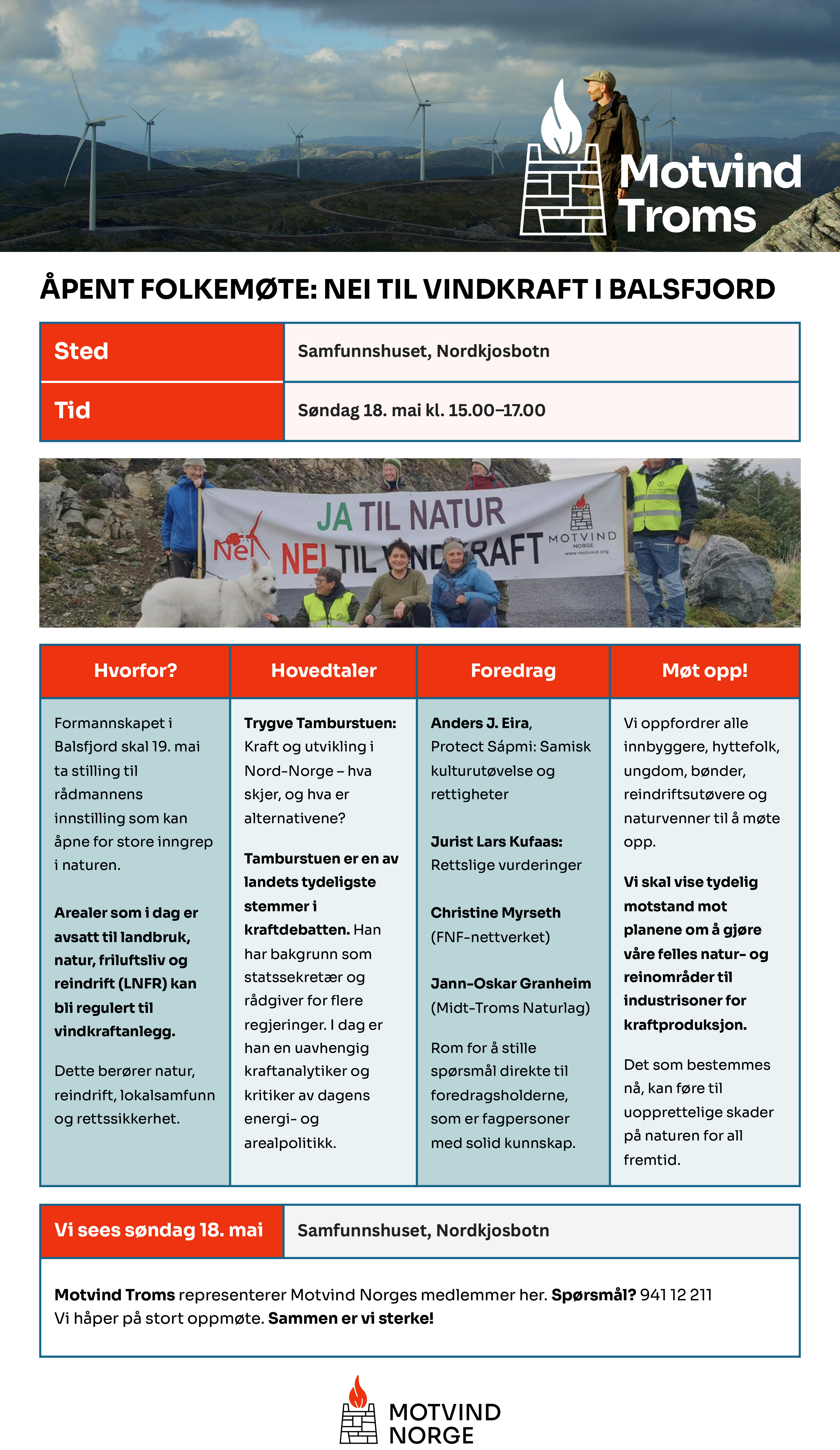 Søndag 18. mai kl. 15.00–17.00 inviterer Motvind Troms til åpent folkemøte på Samfunnshuset i Nordkjosbotn. Arrangementet skjer i forkant av formannskapets behandling av rådmannens forslag om å åpne store naturområder i Balsfjord for vindkraftutbygging.