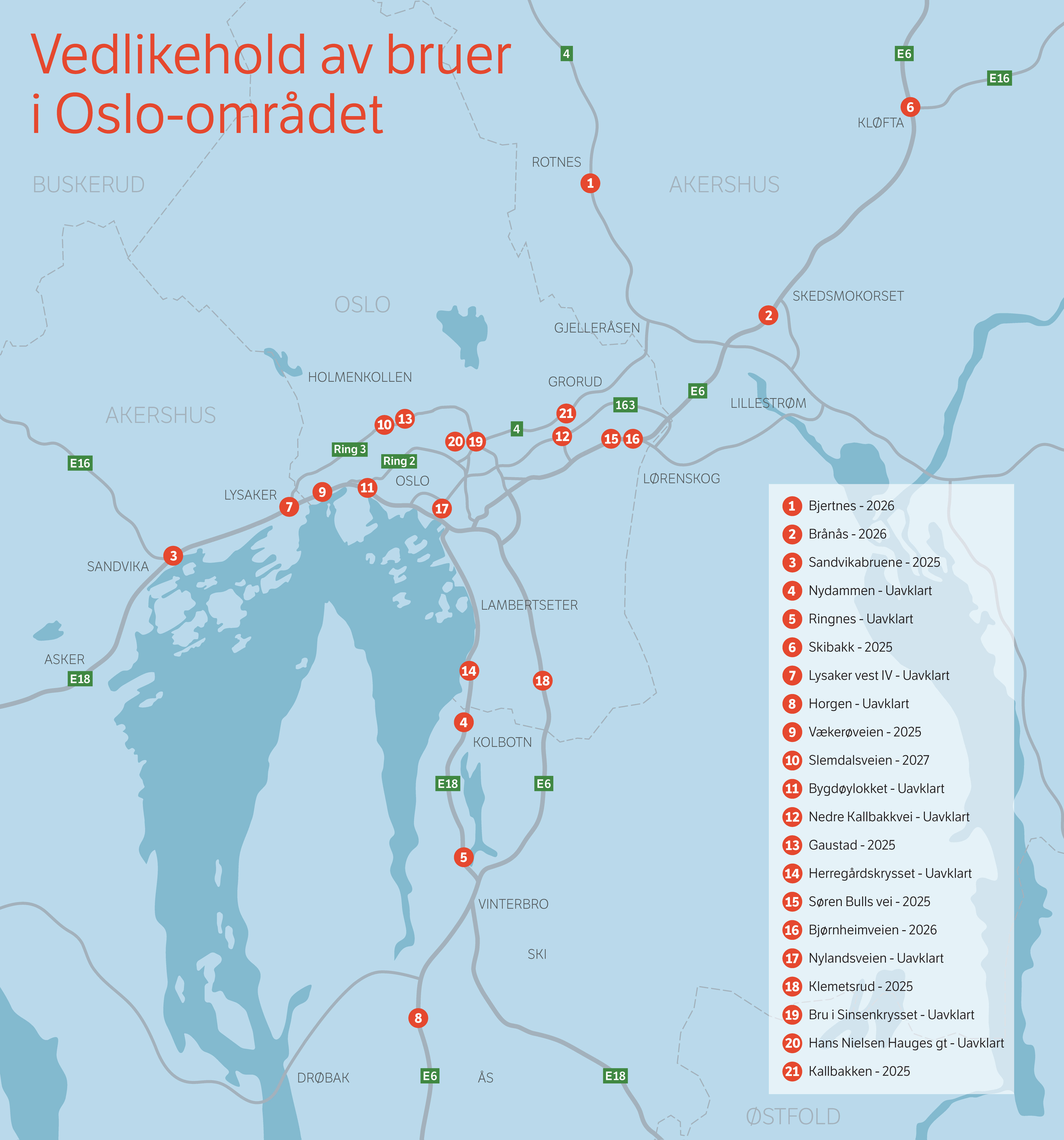 Disse konstruksjonene har blitt fortløpende vedlikeholdt, men nå står de overfor mer omfattende tiltak. Disse vedlikeholdstiltakene er Statens vegvesen i full gang med å planlegge for. Disse vedlikeholdsarbeidene vil gi store trafikale utfordringer i år og årene fremover i Oslo-området.