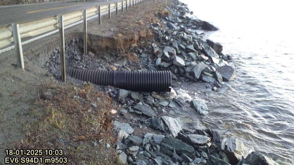 Veien må repareres etter at stormen 17. januar 2025 vasket ut deler av veikroppen og eksisterende erosjonssikring.
