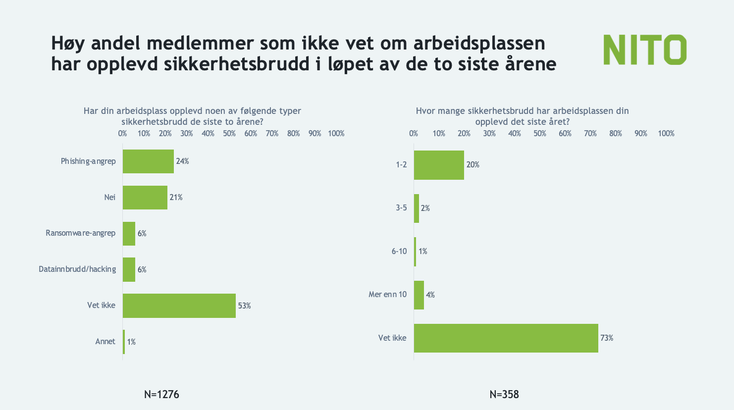 Undersøkelsen viser også at 73 prosent ikke vet hvor mange sikkerhetsbrudd arbeidsplassen har opplevd det siste året. 20 prosent svarer at de har opplevd 1-2 sikkerhetsbrudd, mens 4 prosent sier arbeidsplassen har opplevd mer enn 10 sikkerhetsbrudd det siste året.