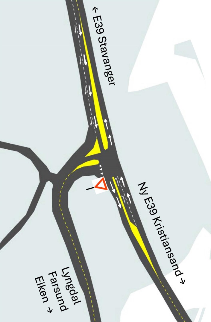 Østgående trafikk ledes direkte inn ny E39. Det er også etablert avkjøringsfelt for trafikk som skal bruke gamle E39 retning Lyngdal.