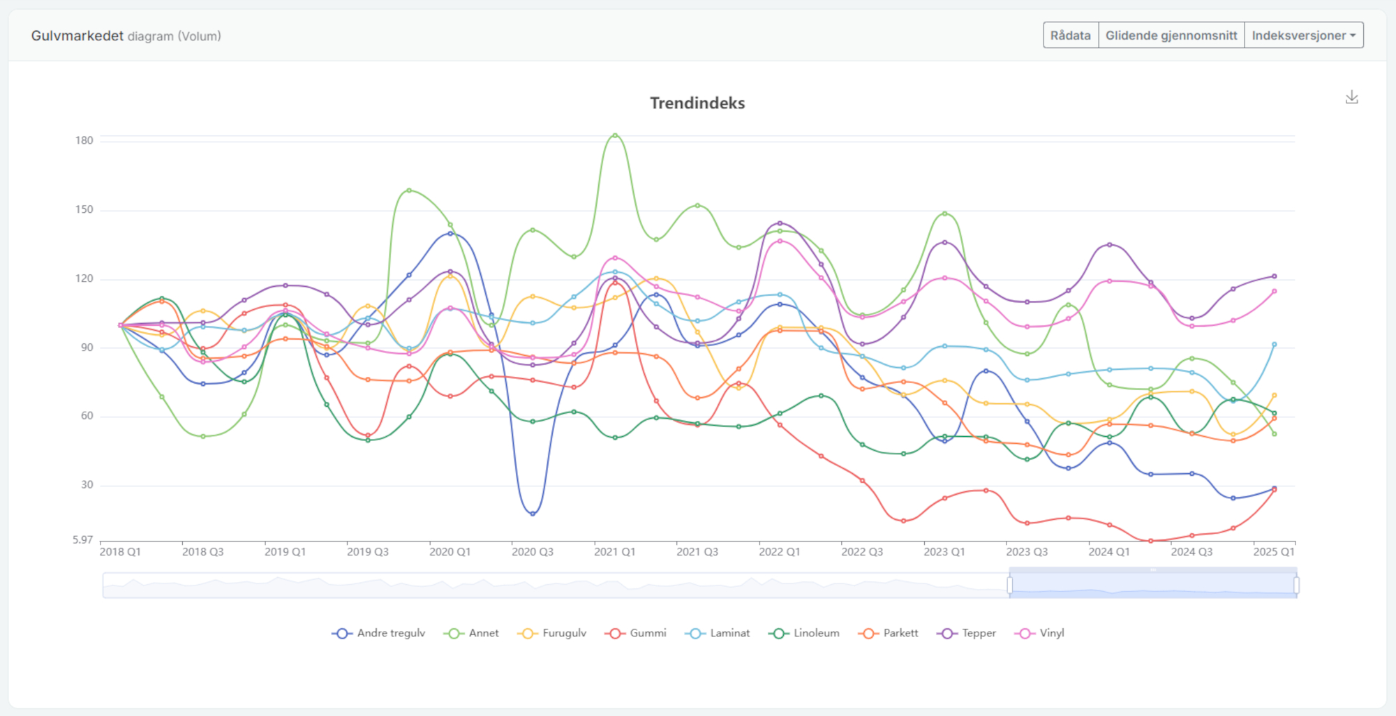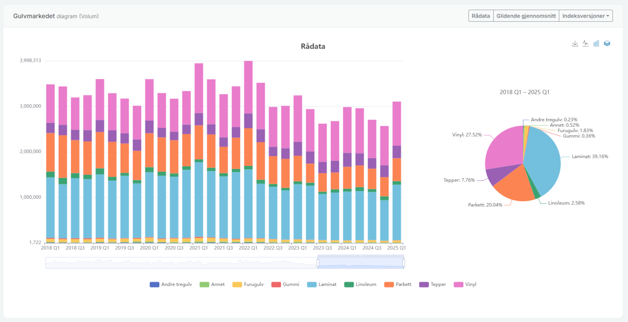 I det dashbordet som brukeren ser presenteres gulvmarkedet i volum og verdi, med rådata, gjennomsnittsdiagrammer og flere andre typer indeksvarianter. Statistikken kan brytes ned på produktgrupper og enkeltprodukter. De medlemmene som sender inn egne tall vil kunne se utvikling og markedsandeler holdt opp mot totalmarkedet. En ytterligere bonus er det AI-verktøy som kan gi økt innsikt ved å analysere valgte deler av statistikken. AI-verktøyet gir brukeren ekstra innsikt i historiske trender og viktig endringer de to-tre siste årene og kan levere en analyse av sannsynlig utvikling på kort sikt.
