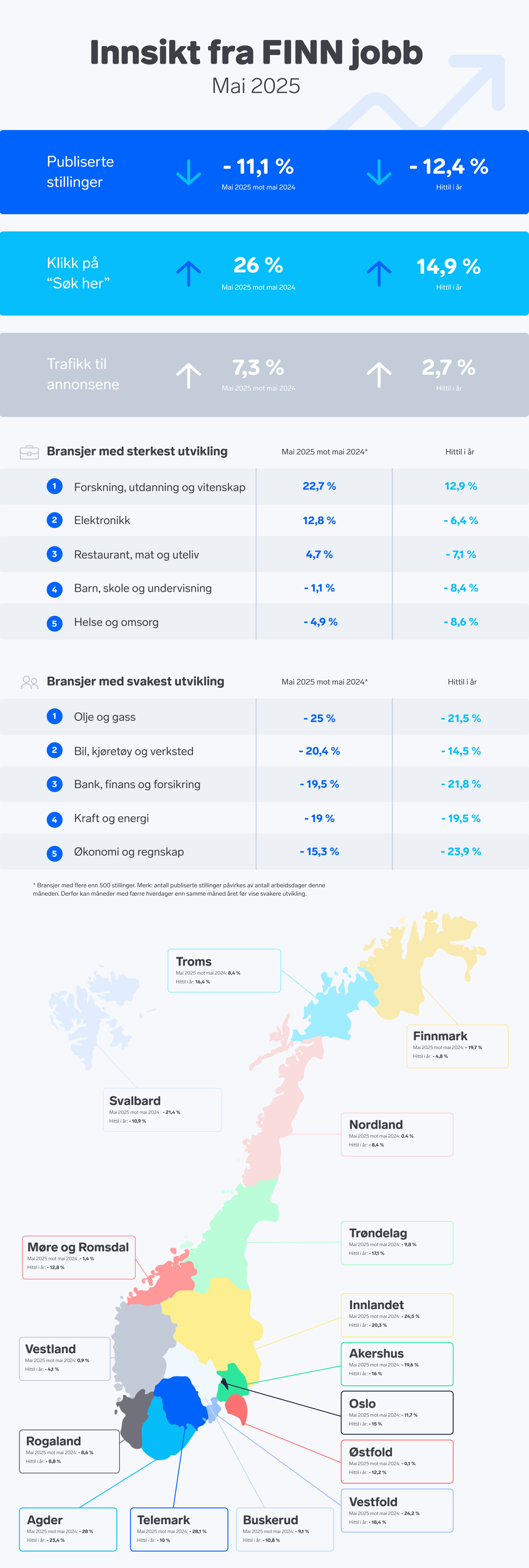 Behovet for sommervikarer har også gjort seg gjeldende på stillingsmarkedet. Bransjen Restaurant, mat og uteliv hadde en vekst på nesten 5 prosent i mai, som samsvarer med den sesongbaserte etterspørselen i sektoren. I motsatt ende av skalaen finner vi Olje og gass, som hadde en betydelig nedgang i stillingsutlysninger – hele 25 prosent lavere enn i mai i fjor. Denne bransjen har en nedgang på 21 prosent hittil i år.