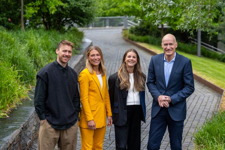 Dette er fire av profilene som skal jobbe med fotball-EM på TV 2 og NRK. Fra venstre: Carl-Erik Torp (NRK), Mimmi Löfwenius Veum (TV 2), Andrine Hegerberg (NRK) og Erik Thorstvedt (TV 2). Foto: Jan-Petter Dahl/TV 2