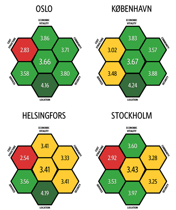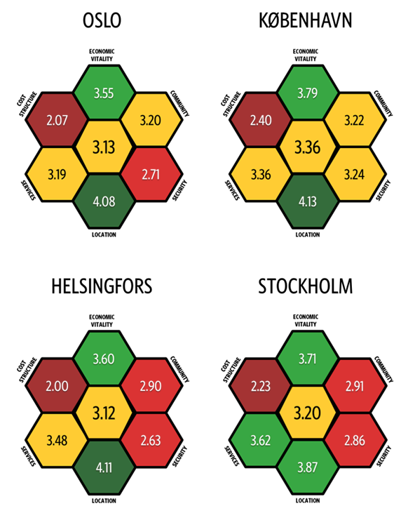 "København er best i målingen på fem ulike sektorer: økonomisk livskraft, transportforbindelser, boligpriser, trivsel og fremfor alt trygt bomiljø. Forskjellen i sikkerhetsoppfatninger er betydelig sammenlignet med andre byer – de andre byene havnet på et svakt nivå i dette attraktivitetsområdet", sier Harri Leinikka, administrerende direktør i Reputation and Trust Analytics som har gjennomført undersøkelsen.