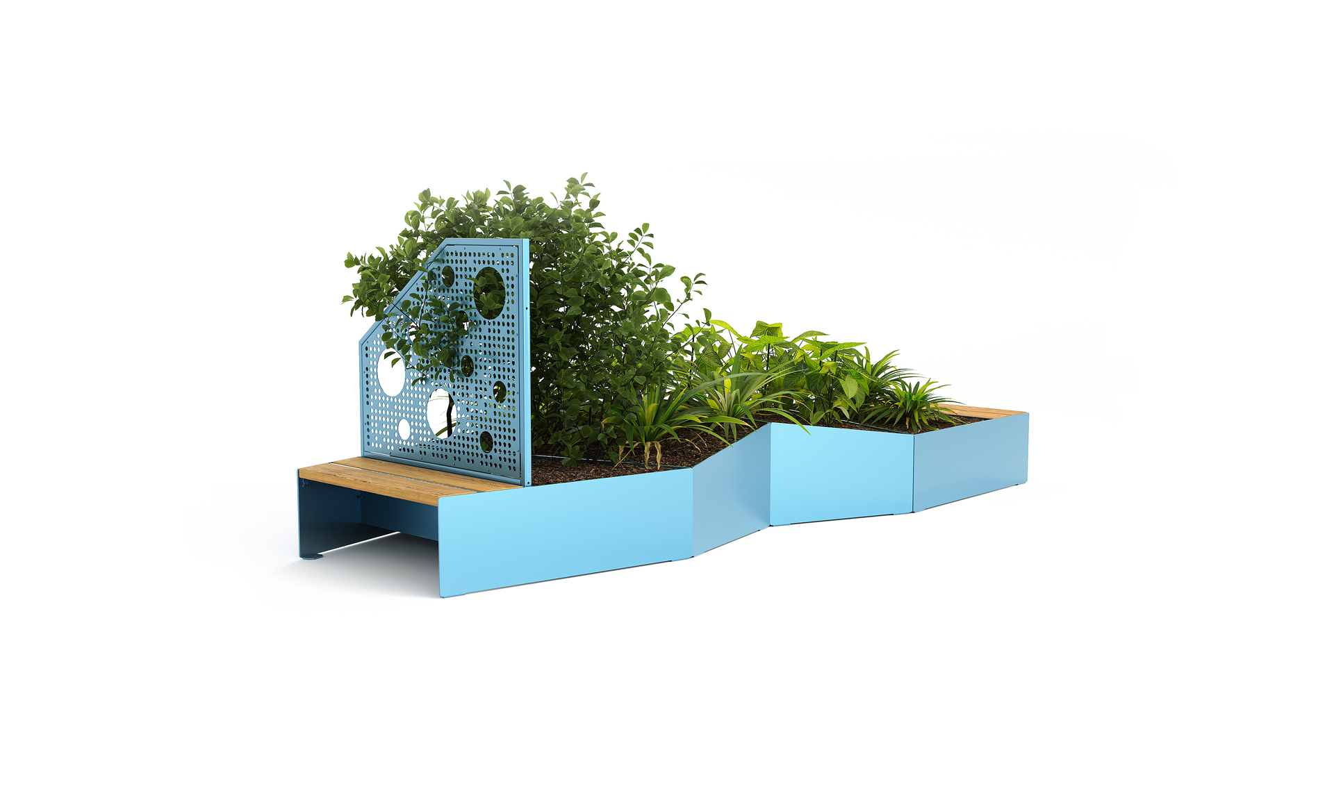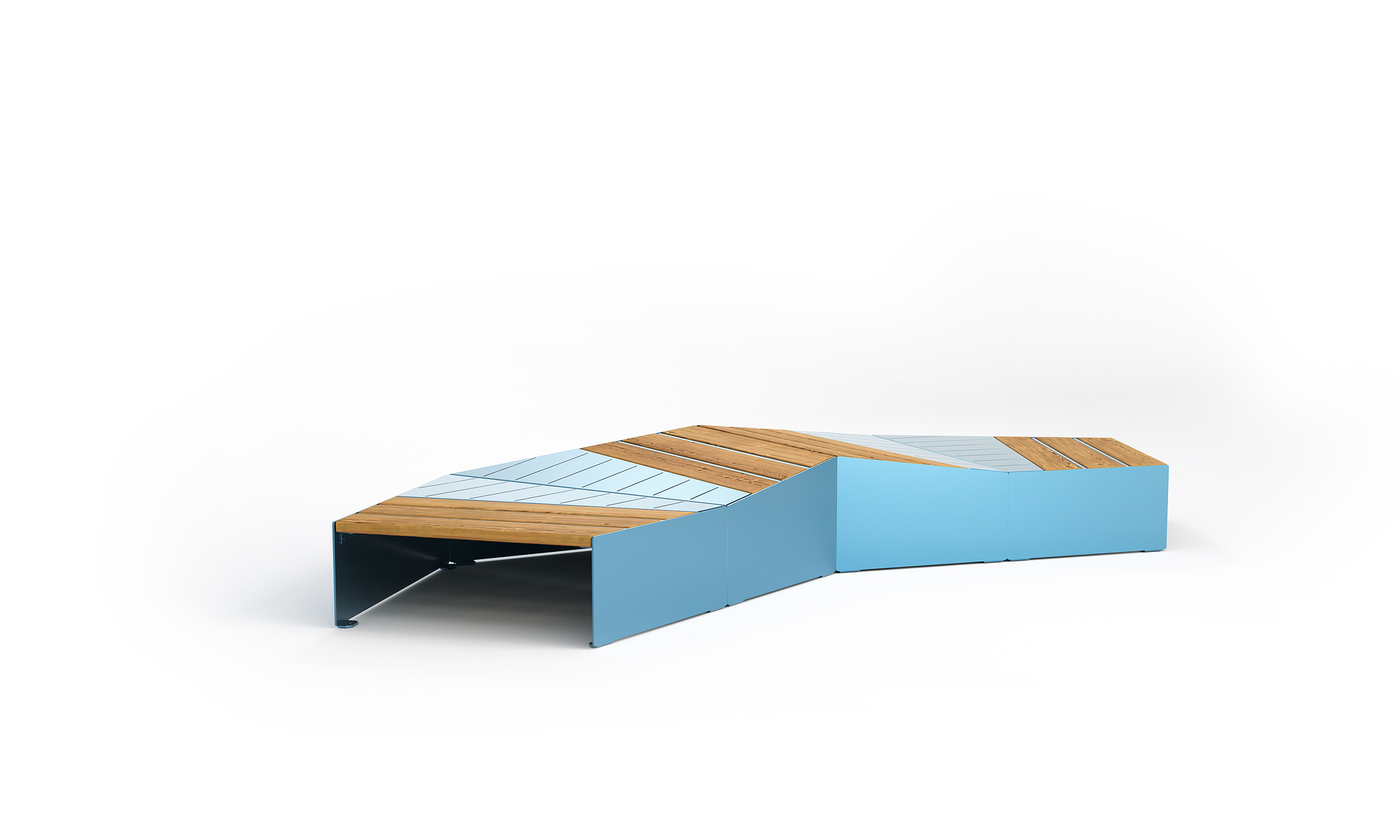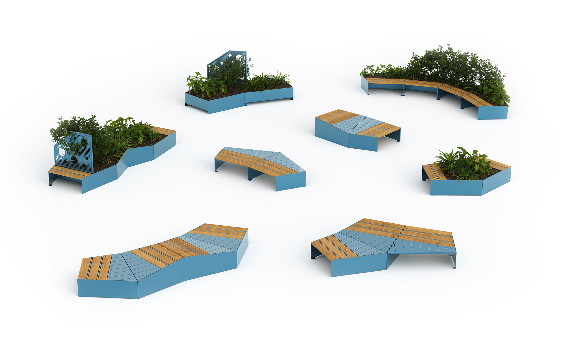 Hver modul har fire sider av ulik lengde. Modulene er tilgjengelige i speilede konfigurasjoner, med enten flate eller skrånede sitteflater. Overflatene er dels av tre og dels av stål. Plantekassemodulene følger samme asymmetriske design og kan utstyres med ståvegger for klatreplanter – som også fungerer som ryggstøtter med gjennomsiktige åpninger. Overflatene er dels av tre og dels av stål.