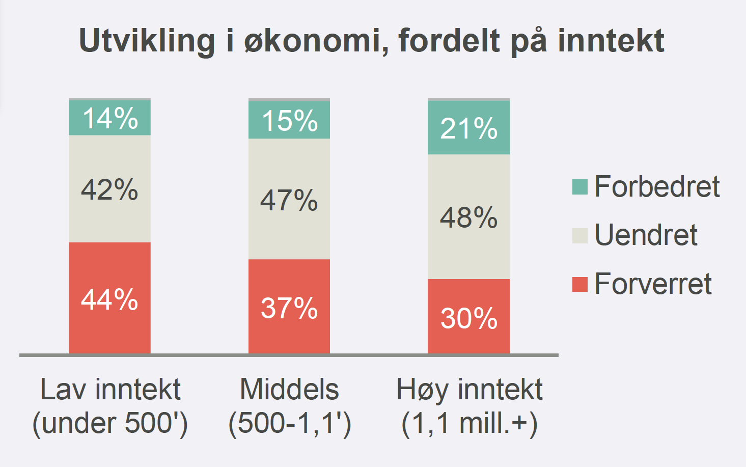 Tallene viser også at forskjellene ser ut til å øke. Av de med lavest inntekt, svarer 44 prosent at økonomien er forverret, mens kun 30 prosent av de med høyest inntekt, svarer det samme.