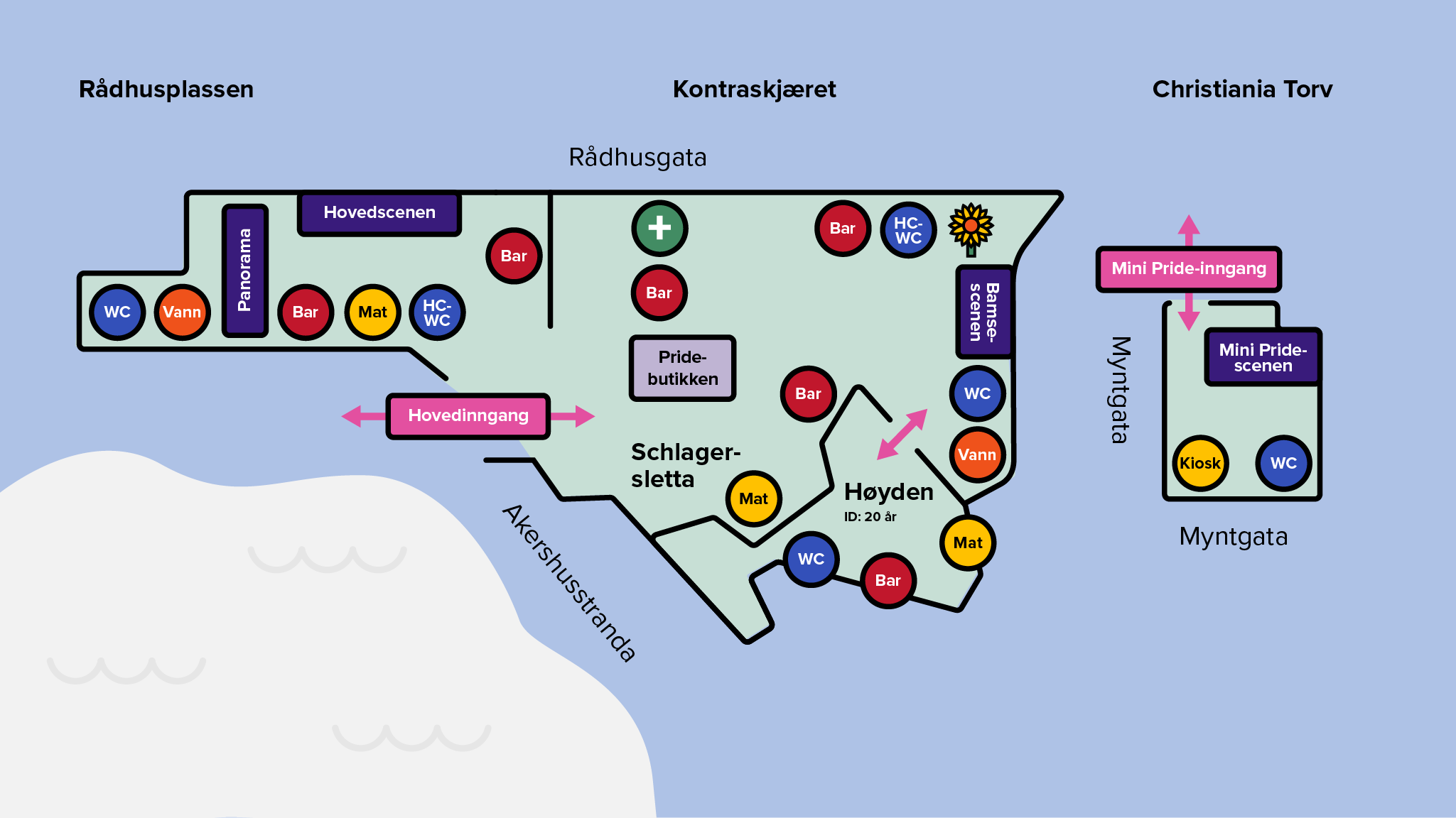 Etter et mellomår i Sofienbergparken flytter Pride Park tilbake til Kontraskjæret – og i år utvides området med både Rådhusplassen og Høymagasinet. Dette er den største Pride Park i Oslo Prides historie, med dobbelt så stor kapasitet som i fjor. Her finnes noe for alle – fra store sceneshow til hyggelige sosiale soner i grønne omgivelser!