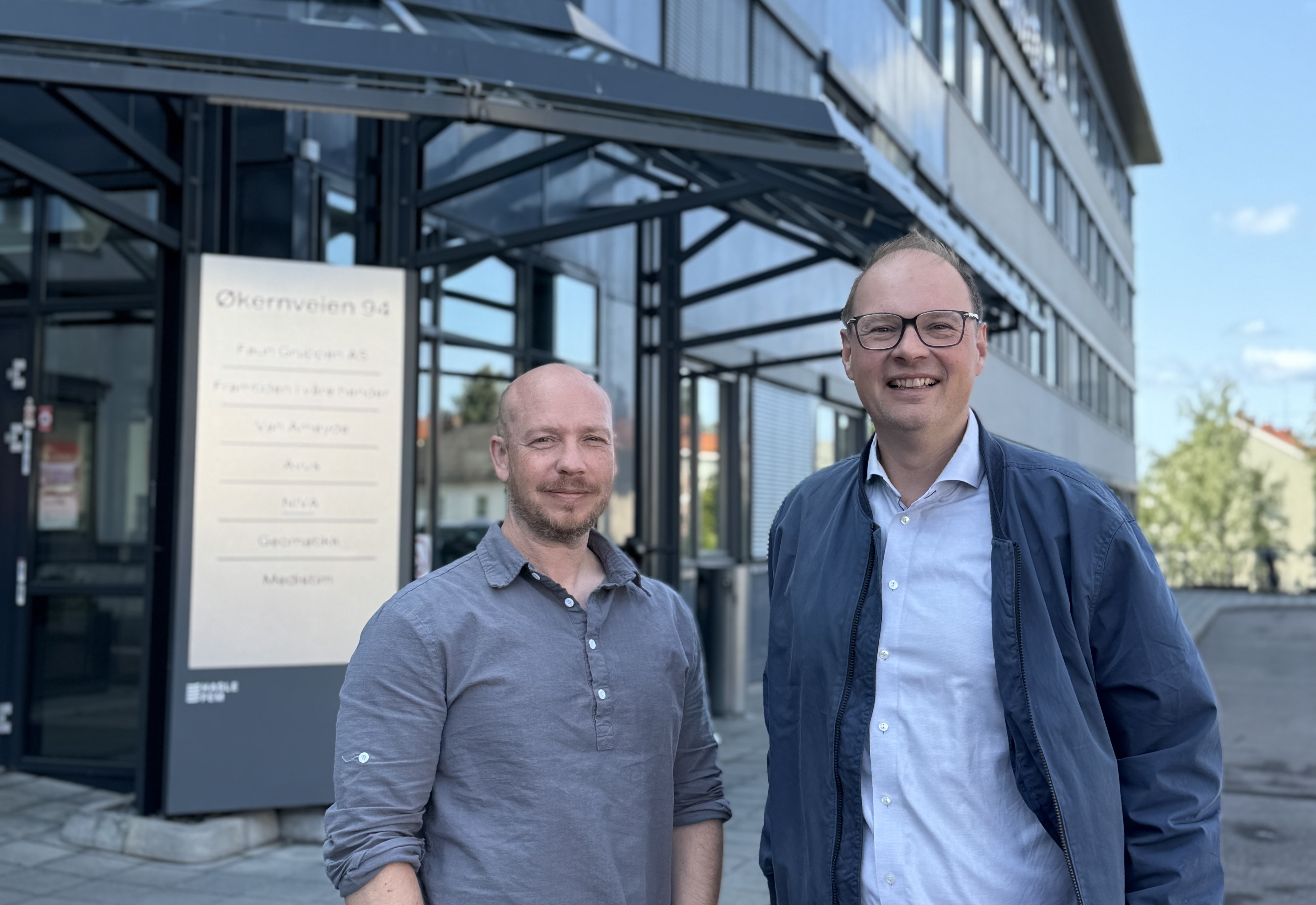 F.v. Isak Oksvold (direktør miljø- og bærekraft) og Erik Borgen (teknisk eiendomssjef) er fornøyde med 15 % reduksjon av energiforbruket som følge av bruk av KI løsningen "R8 Jenny".
