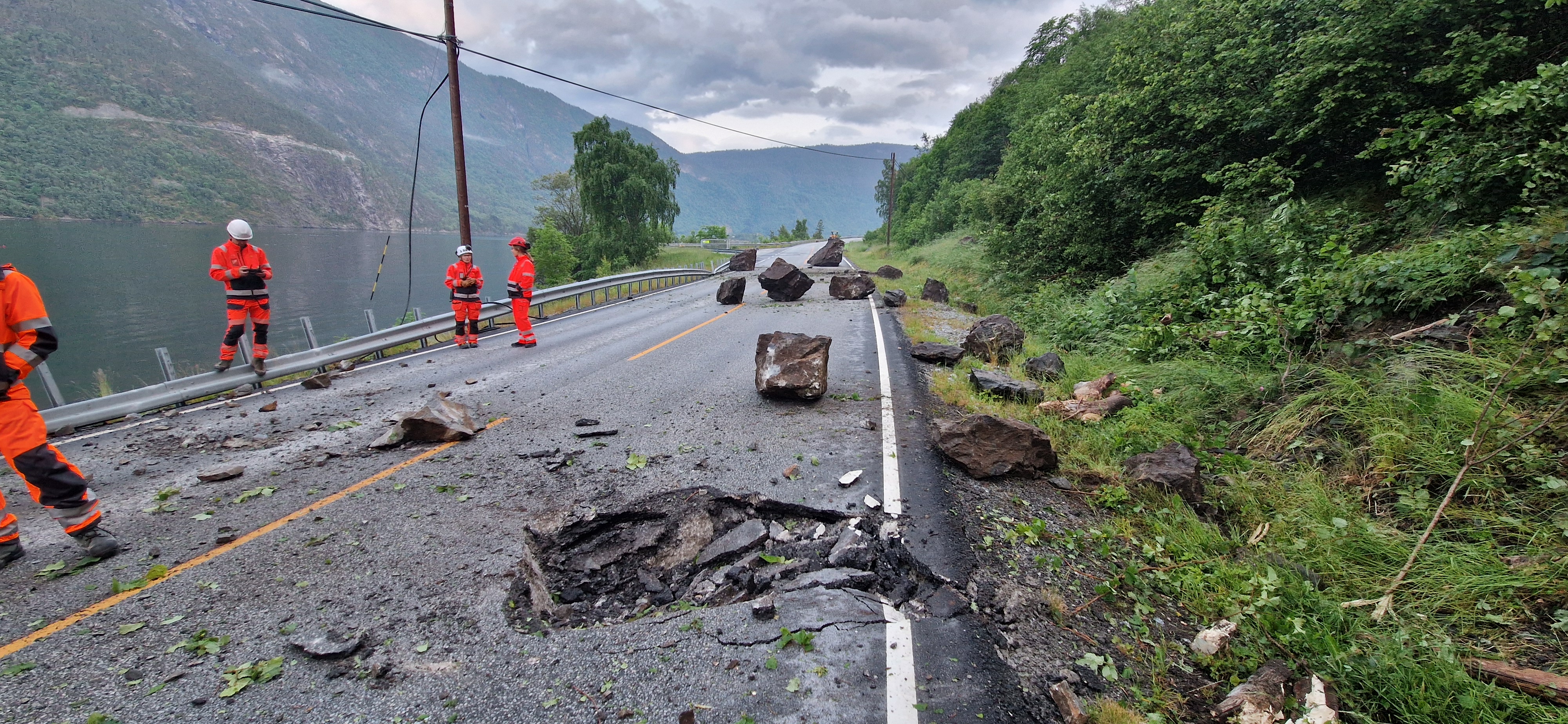 Dei var raskt på plassen etter ein såg skadeomfanget, og ordna opp att vegen utover natta. Vegen vart opna att om lag 05.30 måndag morgon.
