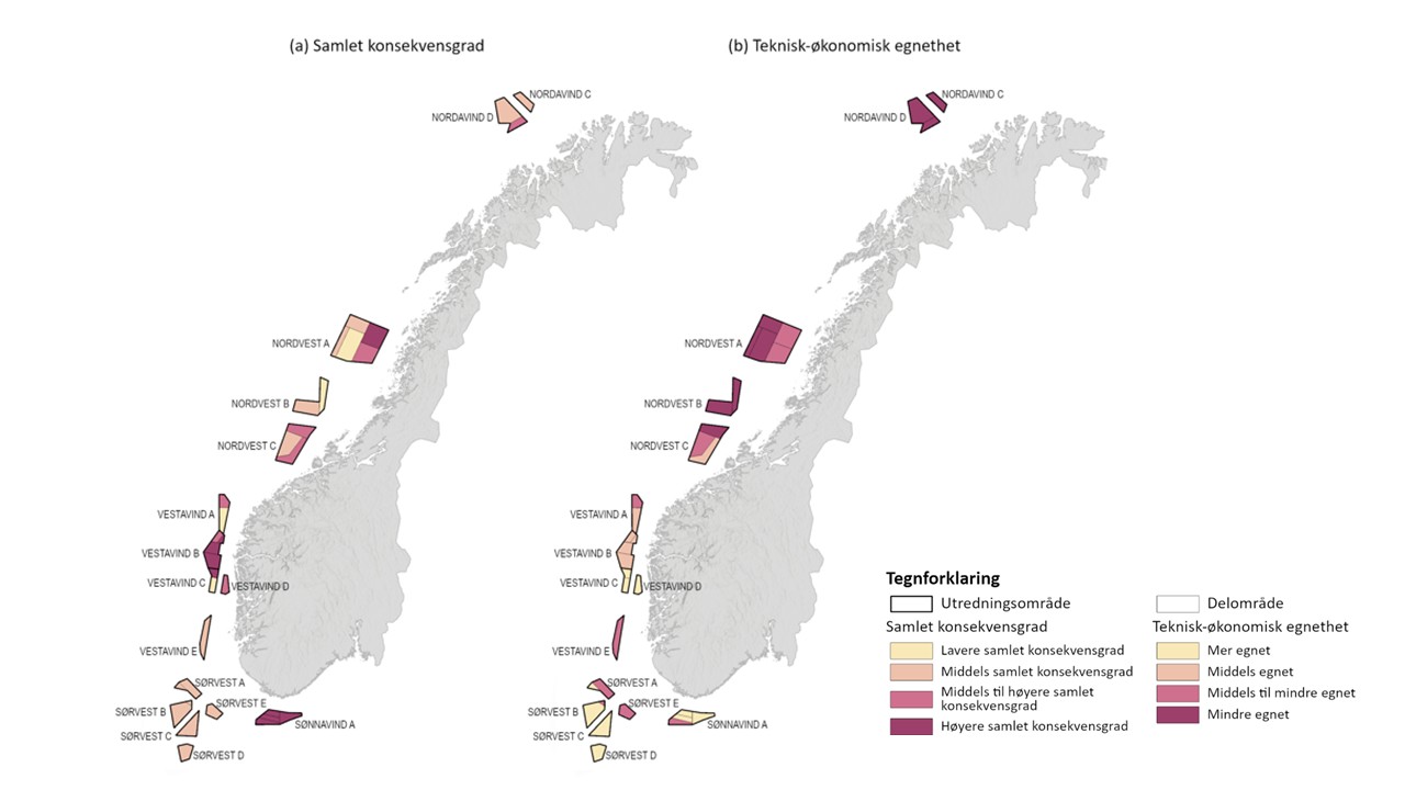 Noen av områdene skiller seg ut ved at de både har bedre tekniske og økonomiske forutsetninger for havvind, og ved at konsekvensene samlet sett vil være begrensede.