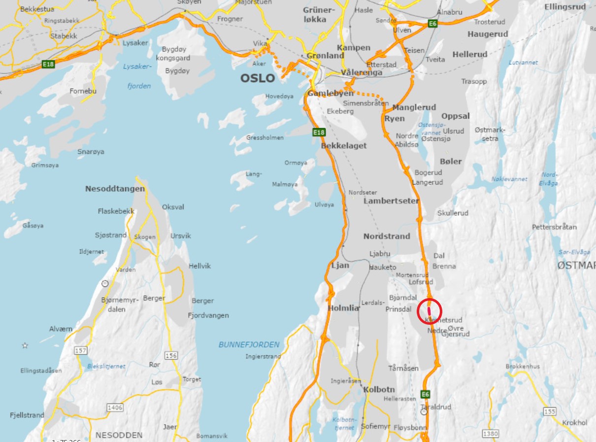 E6 Klemetsrud bru øst er en del av E6 sør for Oslo, og det er trafikantene som kjører mot hovedstaden som blir berørt av vedlikeholdsarbeidet.