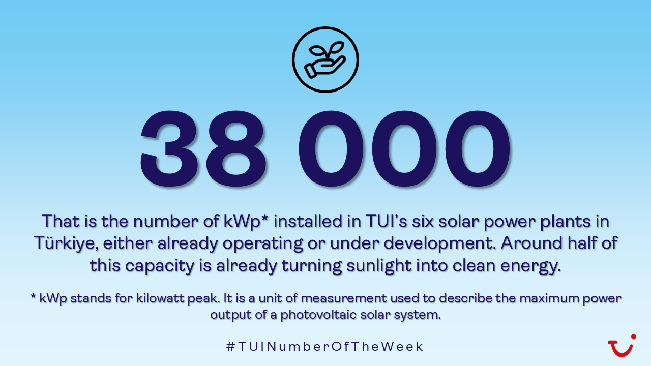 Dette er det totale antallet kWp i de seks solcelleanleggene TUI har etablert i Tyrkia som enten er i drift eller under utvikling. Omtrent halvparten av kapasiteten er allerede i ferd med å gjøre sollys om til ren energi. Solkraft spiller en viktig rolle i å redusere utslippene i hele hotellporteføljen vår. Det er ett av mange skritt på veien mot mer bærekraftig turisme.