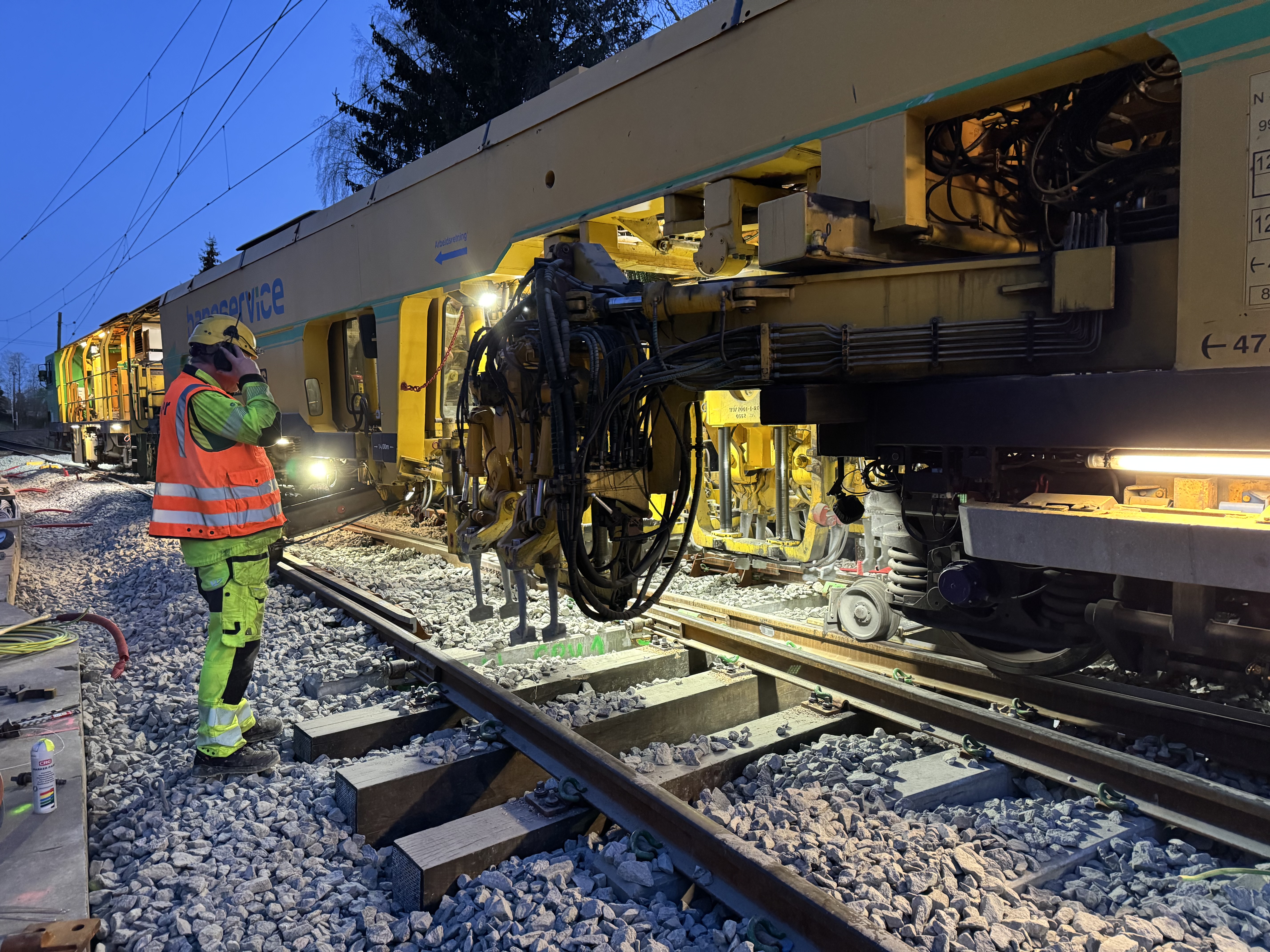 Arbeidet med å fornye Hovedbanen startet i fjor, og varer fram til 2028. Vi gjennomfører en fullstendig fornyelse av både sporet og togenes kjørestrøm på denne strekningen. Vi bytter master og kontaktledning. I sommer skal to store skinnegående maskiner både legge nytt spor og rense samt legge ut ny pukkstein som ligger under sporet. Et nytt spor og underlag gir mindre slitasje på togene, passasjerene får en mer komfortabel reise, og naboene til jernbanen vil merke mindre støy når togene kjører forbi.