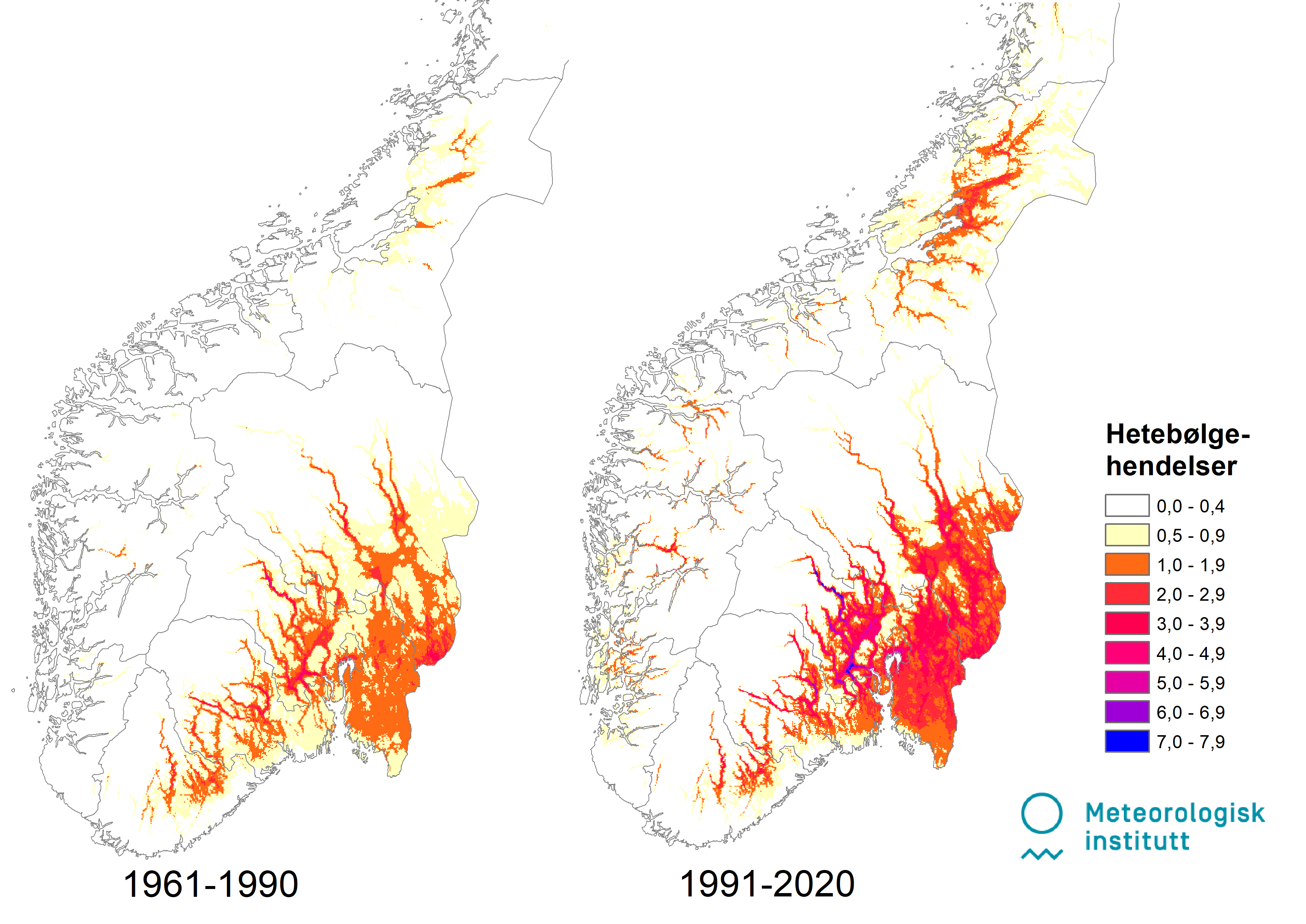 – Hvis vi sammenlikner nåværende normalperiode (1991-2020) med tidligere (1961-1990), ser vi at større områder blir rammet av hetebølger. De strekker seg lenger innover i landet og de kommer hyppigere enn tidligere.
