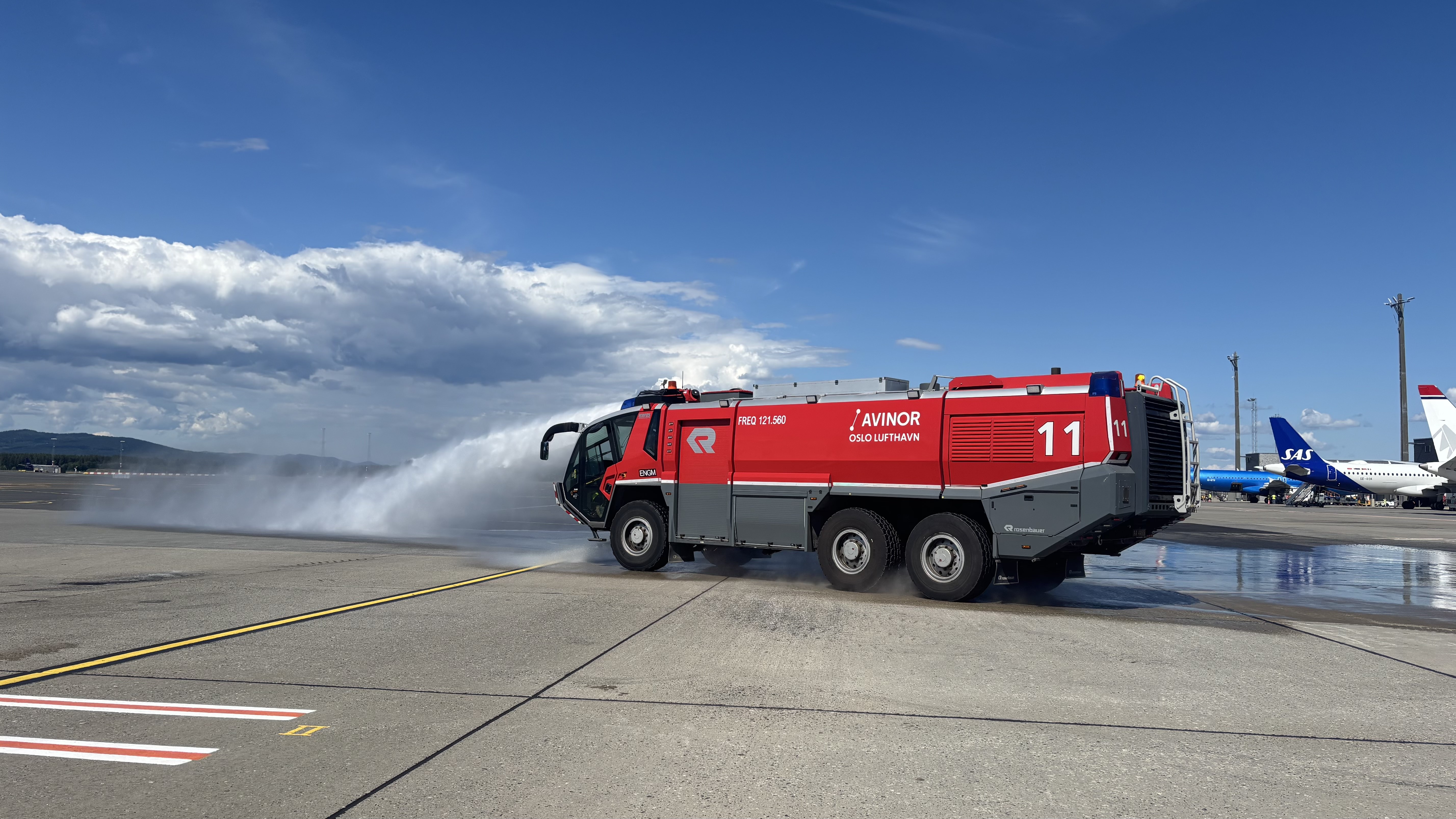 Dysene over brannbilen åpnes og gjøres klare. Etter en kjapp avklaring med flygelederne i tårnet får brannbilen tillatelse til å kjøre ut på området.