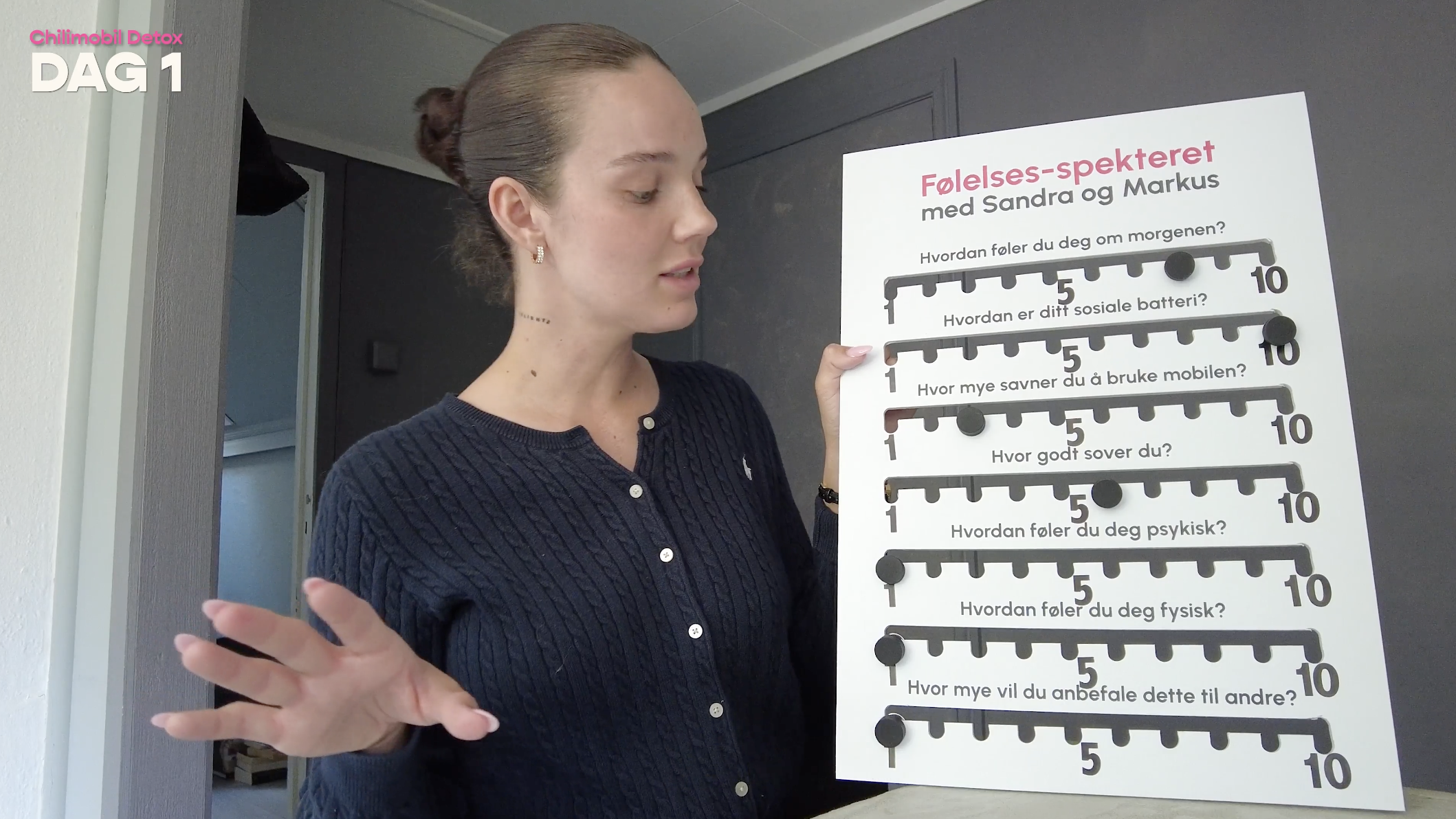 Sandra viser fram følelsespekteret, hvor hun rangerer hvordan hun føler seg på ulike punkt hver dag.
