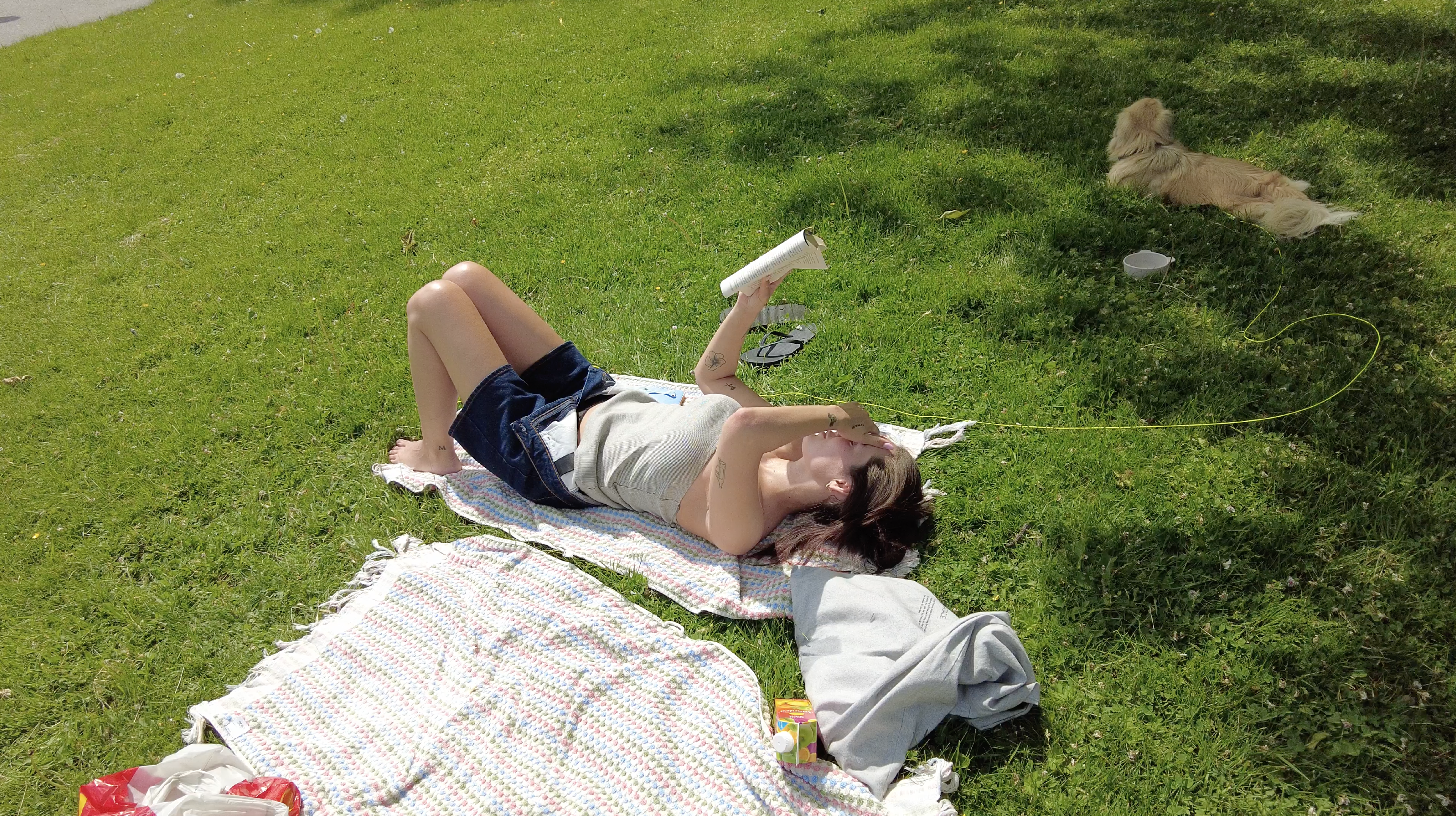 Kvinne ligger på et teppe i gresset og leser en bok. En hund ligger ved siden av henne.