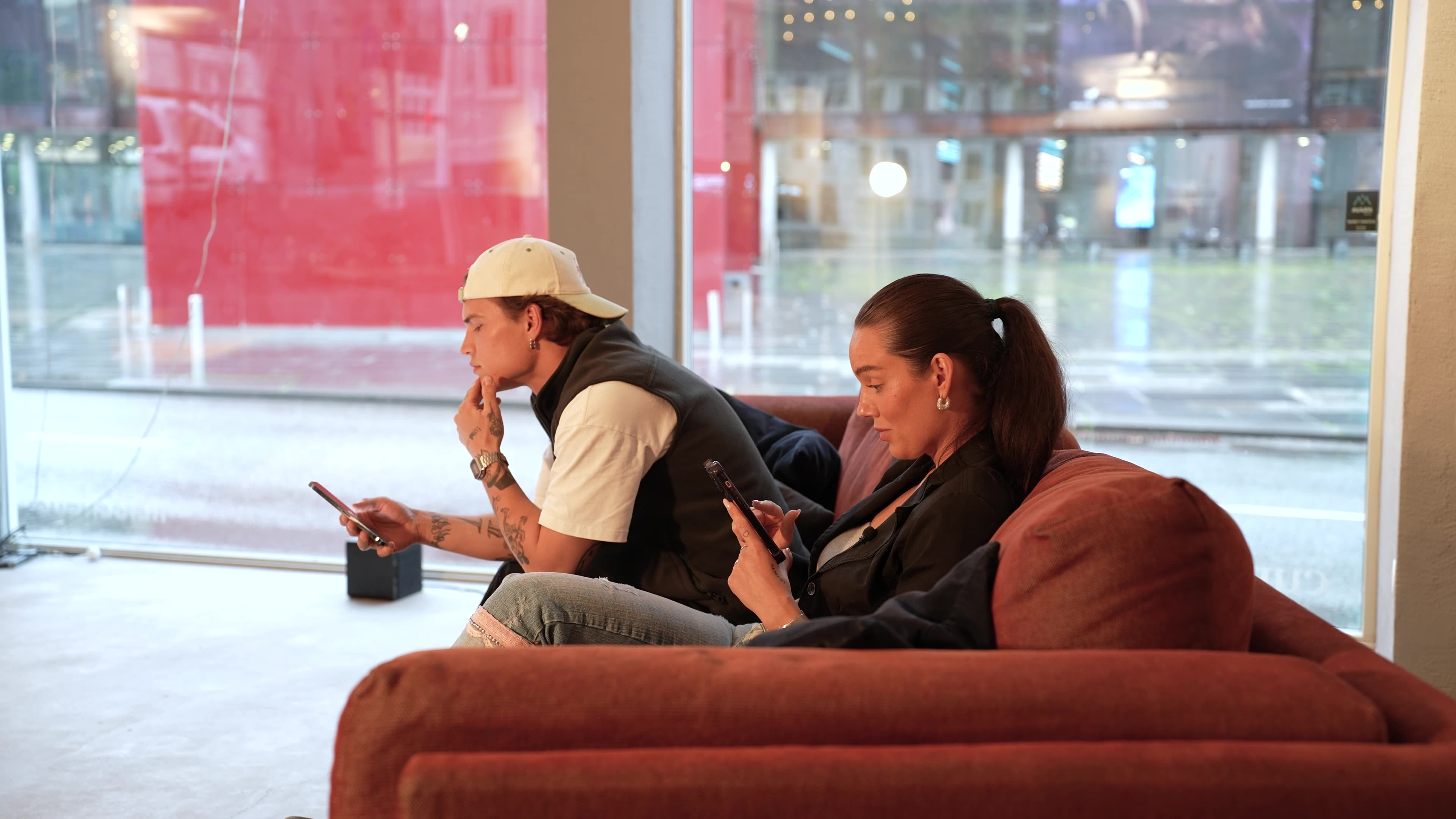 To personer sitter på en sofa og ser på telefonene sine.